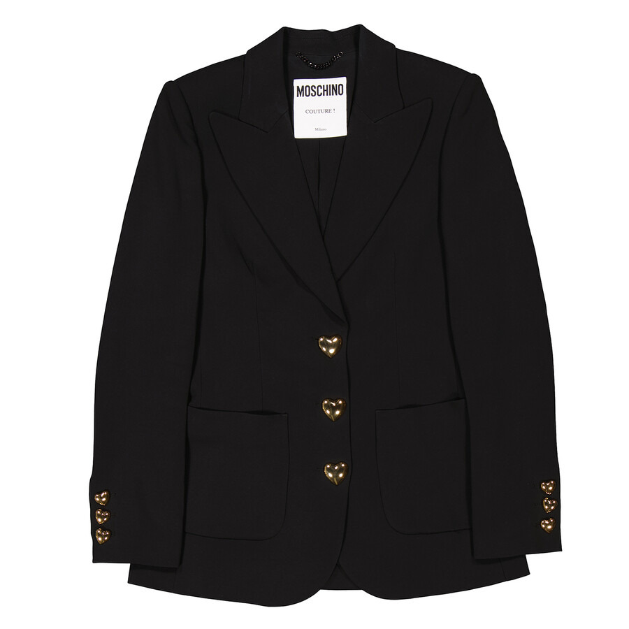 Moschino Ladies Outerwear. Fashion category: Blazers. SKU: 232E A0540. Color: Black. Moschino Ladies Black Tailored Couture Blazer. The Moschino Couture blazer with a structured, tailored fit boasts a classic notched lapel, front button closure, adorned with oversized, gold-tone heart-shaped buttons, and two large front patch pockets, enhancing its sleek and elegant silhouette. GENERAL Color: Black INFORMATION Brand: Moschino Gender: Womens Model: 232E A0540 DETAILS Category: Outerwear Apparel Type: Blazers ADDITIONAL INFO Jomashop Sku: -232EA0540BLACK Department: Apparel