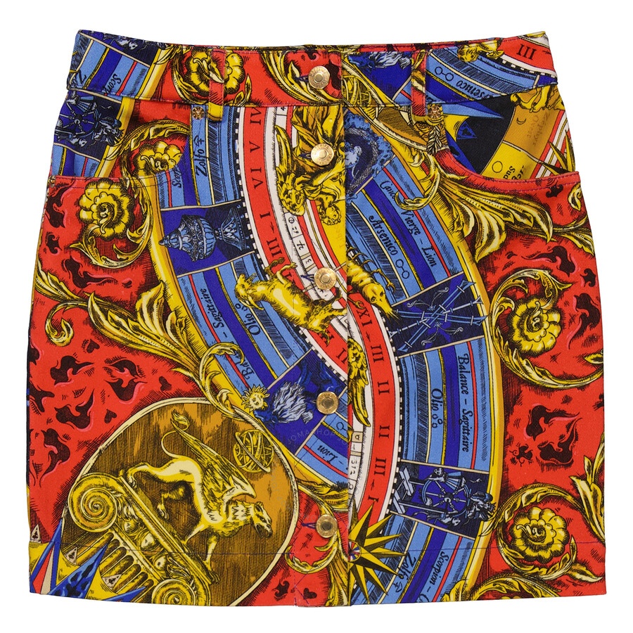 Moschino Ladies Bottoms. Fashion category: Skirts. SKU: 0109-5551-A1888. Color: Multicolor. Moschino Ladies Printed Denim Twill Skirt. This cotton blend denim skirt features a mid rise, a front button fastening, two back patch pockets, waistband with belt loops and a short length. Materials: 97% cotton, 3% other fibers. GENERAL Color: Multicolor INFORMATION Brand: Moschino Gender: Womens Model: 0109-5551-A1888 DETAILS Category: Bottoms Apparel Type: Skirts ADDITIONAL INFO Jomashop Sku: -01095551A1888 Department: Apparel