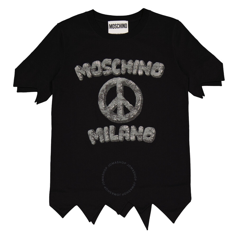 Moschino Ladies Tops. Fashion category: Graphic Tees. SKU: A0797-6041-1555. Color: Black. Moschino X The Flintstone Black Organic Cotton Logo Print T-Shirt. Made from 100% organic cotton, this t-shirt features a crew neckline, short sleeves and bottom with decorative trims and detailed with a a three-dimensional, stone-effect print with the brand's logo and peace sign in grey across the front. GENERAL Color: Black INFORMATION Brand: Moschino Gender: Womens Model: A0797-6041-1555 DETAILS Category: Tops Apparel Type: Graphic Tees Material: Cotton ADDITIONAL INFO Jomashop Sku: -A079760411555 Department: Apparel