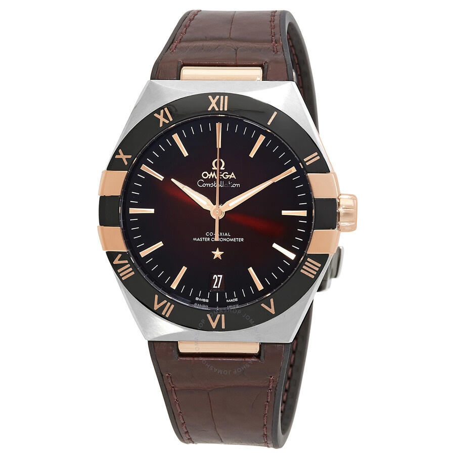 Stainless steel and 18kt rose gold case with a burgundy leather strap. Fixed polished black ceramic bezel. Burgundy dial with rose gold hands and index hour markers. Minute markers around the outer rim. Dial Type: Analog. Date display at the 6 o'clock position. Omega Calibre 8900 Automatic movement, based upon Omega 8500, containing 39 Jewels, bitting at 25200 vph, and has a power reserve of approximately 60 hours. Scratch resistant sapphire crystal. Pull / push crown. Transparent case back. Round case shape, case size: 41 mm. Band width: 24.2 mm. Water resistant at 50 meters / 165 feet. Functions: date, hour, minute, second, co-axial escapement, chronometer. Constellation Series. Luxury watch style. Watch label: Swiss Made. Omega Constellation Automatic Chronometer Burgundy Dial Men's Watch 131.23.41.21.11.001. GENERAL Box Type: Original Box CASE Case Size: 41 Case Material: Stainless Steel and 18kt Rose Gold Case Shape: Round Case Back: Transparent BAND Band Material: Leather Band Type: Strap Band Color: Burgundy Band Width: 24.2 mm DIAL Dial Color: Burgundy Type: Analog Crystal: Scratch Resistant Sapphire Hands: Rose Gold Dial Markers: Index Second Markers: Minute Markers around the outer rim Bezel: Fixed Bezel Color: Polished Black Bezel Material: Ceramic Crown: Pull / Push INFORMATION Brand: Omega Series: Constellation Collection Name: Constellation Gender: Mens Model: 131.23.41.21.11.001 Watch Label: Swiss Made Movement: Automatic Engine: Omega Calibre 8900 Power Reserve: 60 hours FEATURES Water Resistance: 50 meters / 165 feet Calendar: Date display at the 6 o'clock position Functions: Date, Hour, Minute, Second, Co-Axial Escapement, Chronometer Watch Features: Analog, Chronometer, Ceramic, Gold, Leather, Stainless Steel ADDITIONAL INFO Watch Style: Luxury Warranty: 2 Year Jomashop Warranty Jomashop Sku: OM13123412111001 Department: Watches Category: Watches