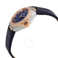 Silver-tone stainless steel case with a blue leather strap. Fixed 18kt rose gold bezel set with diamonds. Blue dial with rose gold-tone hands and diamond hour markers. Dial Type: Analog. Date display at the 6 o'clock position. Omega Calibre 8700 automatic movement with a 50-hour power reserve. Scratch resistant sapphire crystal. Pull / push crown. Transparent case back. Round case shape, case size: 29 mm. Band width: 17.6 mm. Water resistant at 50 meters / 165 feet. Functions: date, hour, minute, second, co-axial escapement, chronometer, magnetic resistant. Constellation Series. Dress watch style. Watch label: Swiss Made. Omega Constellation Automatic Chronometer Diamond Blue Dial Ladies Watch 131.28.29.20.99.003. INFORMATION Brand: Omega Series: Constellation Collection Name: Constellation Gender: Womens Model: 131.28.29.20.99.003 Watch Label: Swiss Made Movement: Automatic Engine: Omega Calibre 8700 Power Reserve: 50 hours CASE Case Size: 29 mm Case Material: Stainless Steel Case Shape: Round Case Back: Transparent BAND Band Material: Leather Band Type: Strap Band Color: Blue Band Width: 17.6 mm Clasp: Tang DIAL Dial Color: Blue Type: Analog Crystal: Scratch Resistant Sapphire Hands: Rose Gold-tone Dial Markers: Diamond Bezel: Fixed Bezel Material: 18kt Rose Gold Set With Diamonds Crown: Pull / Push FEATURES Water Resistance: 50 meters / 165 feet Calendar: Date display at the 6 o'clock position Functions: Date, Hour, Minute, Second, Co-Axial Escapement, Chronometer, Magnetic Resistant Watch Features: Analog, Chronometer, Gold, Leather, Stainless Steel, Diamond ADDITIONAL INFO Watch Style: Dress Warranty: 2 Year Jomashop Warranty Jomashop Sku: OM13128292099003 Department: Watches Category: Watches