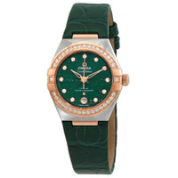 Silver-tone stainless steel case with a green leather strap. Fixed 18kt rose gold bezel set with diamonds. Green dial with rose gold-tone hands and diamond hour markers. Dial Type: Analog. Date display at the 6 o'clock position. Omega Calibre 8700 automatic movement with a 50-hour power reserve. Scratch resistant sapphire crystal. Pull / push crown. Transparent case back. Round case shape, case size: 29 mm. Band width: 17.6 mm. Water resistant at 50 meters / 165 feet. Functions: date, hour, minute, second, co-axial escapement, chronometer, magnetic resistant. Constellation Series. Luxury watch style. Watch label: Swiss Made. Omega Constellation Automatic Chronometer Diamond Green Dial Ladies Watch 131.28.29.20.99.001. INFORMATION Brand: Omega Series: Constellation Collection Name: Constellation Gender: Womens Model: 131.28.29.20.99.001 Watch Label: Swiss Made Movement: Automatic Engine: Omega Calibre 8700 Power Reserve: 50 hours CASE Case Size: 29 mm Case Material: Stainless Steel Case Shape: Round Case Back: Transparent BAND Band Material: Leather Band Type: Strap Band Color: Green Band Width: 17.6 mm Clasp: Tang DIAL Dial Color: Green Type: Analog Crystal: Scratch Resistant Sapphire Hands: Rose Gold-tone Dial Markers: Diamond Bezel: Fixed Bezel Material: 18kt Rose Gold Set With Diamonds Crown: Pull / Push FEATURES Water Resistance: 50 meters / 165 feet Calendar: Date display at the 6 o'clock position Functions: Date, Hour, Minute, Second, Co-Axial Escapement, Chronometer, Magnetic Resistant Watch Features: Analog, Chronometer, Gold, Leather, Stainless Steel, Diamond ADDITIONAL INFO Watch Style: Luxury Warranty: 2 Year Jomashop Warranty Jomashop Sku: OM13128292099001 Department: Watches Category: Watches