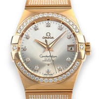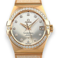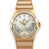 Rose gold-tone 18kt rose gold case and bracelet. Fixed rose gold-tone diamond-set 18kt rose gold bezel. Grey dial with rose gold-tone hands and diamond hour markers. Minute markers around the outer rim. Dial Type: Analog. Luminescent hands. Date display at the 3 o'clock position. Omega Calibre 8501 Automatic movement, based upon Omega 8500, containing 39 Jewels, bitting at 25200 vph, and has a power reserve of approximately 60 hours. Scratch resistant sapphire crystal. Transparent see through case back. Round case shape, case size: 38 mm. Band width: 25 mm. Fold over clasp with a safety release. Water resistant at 100 meters / 330 feet. Functions: date, hour, minute, second, co-axial escapement, chronometer. Constellation Series. Luxury watch style. Watch label: Swiss Made. Omega Constellation Automatic Chronometer Diamond Grey Dial Men's Watch 123.55.38.21.52.005. GENERAL Box Type: Original Box CASE Case Diameter: 38 Case Material: 18kt Rose Gold Case Shape: Round Case Back: Transparent See Through BAND Band Material: 18kt Rose Gold Band Type: Bracelet Band Color: Rose Gold-tone Band Width: 25 mm Clasp: Fold Over with Safety Release DIAL Dial Color: Grey Type: Analog Crystal: Scratch Resistant Sapphire Hands: Rose Gold-tone Dial Markers: Diamond Second Markers: Minute Markers around the outer rim Luminiscence: Hands Bezel: Fixed Bezel Color: Rose Gold-tone Bezel Material: Diamond-Set 18kt Rose Gold INFORMATION Brand: Omega Series: Constellation Collection Name: Constellation Gender: Mens Model: 123.55.38.21.52.005 Watch Label: Swiss Made Movement: Automatic Engine: Omega Calibre 8501 Power Reserve: 60 hours FEATURES Water Resistance: 100 meters / 330 feet Calendar: Date display at the 3 o'clock position Functions: Date, Hour, Minute, Second, Co-Axial Escapement, Chronometer Watch Features: Analog, Chronometer, Gold, Diamond ADDITIONAL INFO Watch Style: Luxury Warranty: 4 Year Jomashop Warranty UPC Code: 683498470243 Jomashop Sku: OM12355382152005 Department: Watches