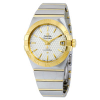 Silver-tone stainless steel case with a silver-tone stainless steel with 18kt yellow gold bars bracelet. Fixed roman numeral 18kt yellow gold bezel. Silver "griffes" dial with luminous yellow gold-tone dauphine-style shape hands and index hour markers. Minute markers around the outer rim. Dial Type: Analog. Luminescent hands and markers. Date display at the 3 o'clock position. Omega Calibre 8500 Automatic movement, containing 39 Jewels, composed of 202 parts, bitting at 25200 vph, and has a power reserve of approximately 60 hours. Scratch resistant sapphire crystal. Pull / push crown. Transparent case back. Round case shape. Case size: 38 mm. Band width: 24 mm. Deployment clasp. Water resistant at 100 meters / 330 feet. Functions: date, hour, minute, second, co-axial escapement, chronometer. Luxury watch style. Watch label: Swiss Made. Omega Constellation Automatic Chronometer Men's Watch 123.20.38.21.02.009. GENERAL Box Type: Original Box CASE Case Size: 38 Case Material: Stainless Steel Case Shape: Round Case Back: Transparent BAND Band Material: Stainless Steel with 18kt Yellow Gold Bars Band Type: Bracelet Band Color: Silver-tone Band Width: 24 mm Clasp: Deployment DIAL Dial Color: Silver "Griffes" Type: Analog Crystal: Scratch Resistant Sapphire Hands: Luminous Yellow Gold-tone Dauphine-style shape Dial Markers: Index Second Markers: Minute Markers around the outer rim Luminiscence: Hands and Markers Bezel: Fixed Roman Numeral Bezel Material: 18kt Yellow Gold Crown: Pull / Push INFORMATION Brand: Omega Series: Constellation Collection Name: Constellation Gender: Mens Model: 123.20.38.21.02.009 Watch Label: Swiss Made Movement: Automatic Engine: Omega Calibre 8500 Power Reserve: 60 hours FEATURES Water Resistance: 100 meters / 330 feet Calendar: Date display at the 3 o'clock position Functions: Date, Hour, Minute, Second, Co-Axial Escapement, Chronometer Watch Features: Analog, Chronometer, Gold, Stainless Steel ADDITIONAL INFO Watch Style: Luxury Warranty: 4 Year Jomashop Warranty UPC Code: 7612586255205 Jomashop Sku: OM12320382102009 Department: Watches Category: Watches