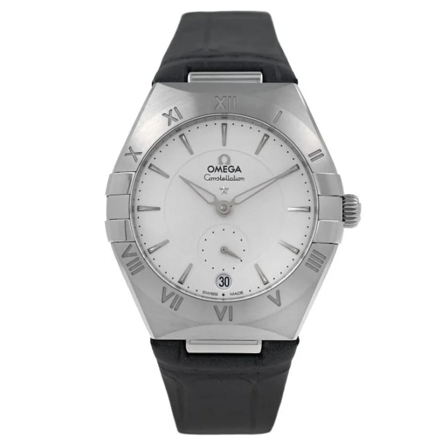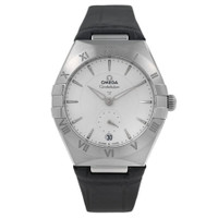 Silver-tone stainless steel case with a grey alligator leather strap. Fixed silver-tone stainless steel bezel. Silver dial with silver-tone hands and index hour markers. Minute markers around the outer rim. Dial Type: Analog. Date display at the 6 o'clock position. One subdial displaying: small second. Omega Calibre 8802 Automatic movement, based upon Omega 8800, containing 35 Jewels, bitting at 25200 vph, and has a power reserve of approximately 55 hours. Scratch resistant sapphire crystal. Pull / push crown. Transparent case back. Round case shape, case size: 34 mm, case thickness: 11.7 mm. Band width: 21.15 mm. Foldover clasp. Water resistant at 50 meters / 165 feet. Functions: date, hour, minute, small second, co-axial escapement, chronometer, magnetic resistant. Constellation Series. Luxury watch style. Watch label: Swiss Made. Omega Constellation Automatic Chronometer Silver Dial Ladies Watch 131.13.34.20.02.001. GENERAL Box Type: Original Box CASE Case Diameter: 34 mm Case Thickness: 11.7 mm Case Material: Stainless Steel Case Shape: Round Case Back: Transparent BAND Band Material: Alligator Leather Band Type: Strap Band Color: Grey Band Width: 21.15 mm Clasp: Foldover DIAL Dial Color: Silver Type: Analog Crystal: Scratch Resistant Sapphire Hands: Silver-tone Dial Markers: Index Second Markers: Minute Markers around the outer rim Sub Dials: One - Small Second Bezel: Fixed Bezel Color: Silver-tone Bezel Material: Stainless Steel Crown: Pull / Push INFORMATION Brand: Omega Series: Constellation Collection Name: Constellation Gender: Womens Model: 131.13.34.20.02.001 Watch Label: Swiss Made Movement: Automatic Engine: Omega Calibre 8802 Power Reserve: 55 hours FEATURES Water Resistance: 50 meters / 165 feet Calendar: Date display at the 6 o'clock position Functions: Date, Hour, Minute, Small Second, Co-Axial Escapement, Chronometer, Magnetic Resistant Watch Features: Alligator Leather, Analog, Chronometer, Leather, Stainless Steel ADDITIONAL INFO Watch Style: Luxury Warranty: 2 Year Jomashop Warranty Jomashop Sku: OM13113342002001 Department: Watches Category: Watches