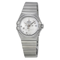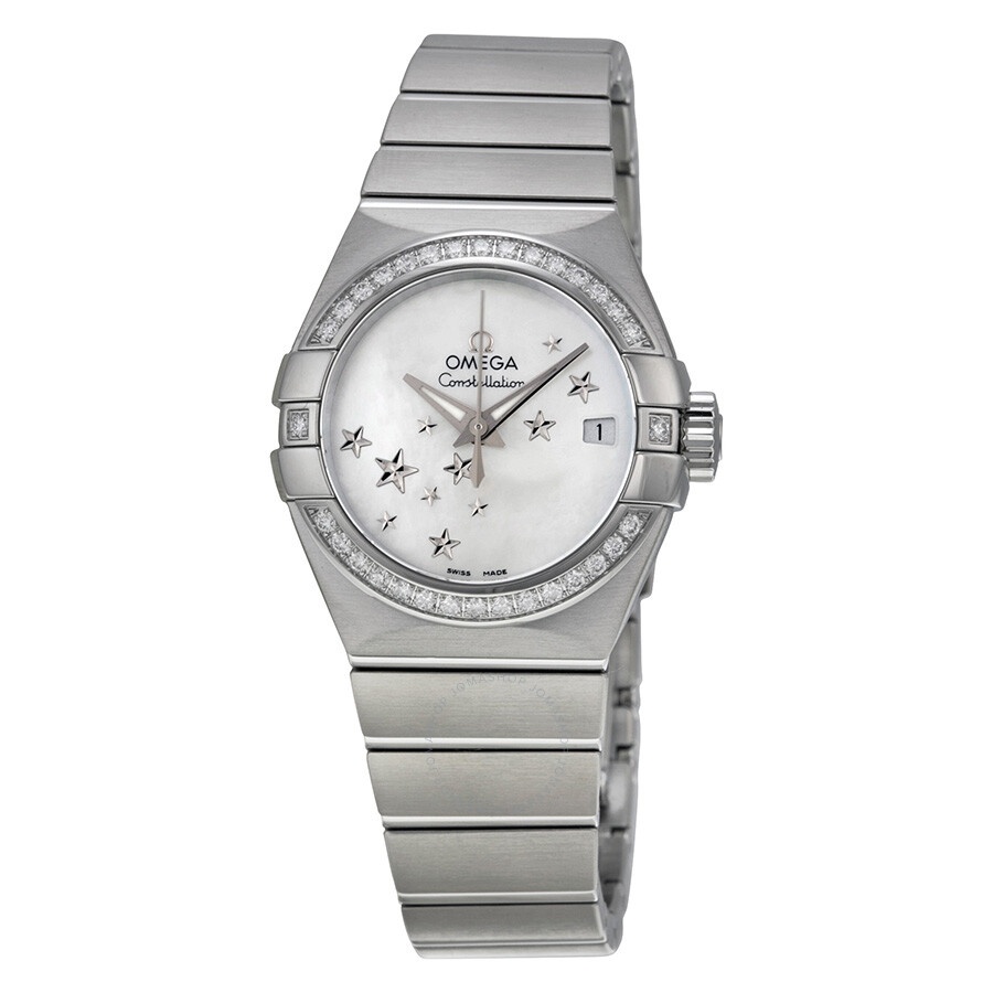 Stainless steel case with a stainless steel bracelet. Fixed stainless steel bezel set with 32 diamonds. Mother of pearl (star design) dial with luminous silver-tone dauphine-style shape hands. Dial Type: Analog. Luminescent hands. Date display at the 3 o'clock position. Omega calibre 8520 automatic movement, based upon Omega 8500, containing 28 Jewels, bitting at 25200 vph, and has a power reserve of approximately 50 hours. Scratch resistant sapphire crystal. Pull / push crown. Skeleton case back. Round case shape. Case size: 27 mm. Case thickness: 8.5 mm. Band width: 16 mm. Band length: 7 inches. Fold over clasp with a push button release. Water resistant at 100 meters / 330 feet. Functions: date, hour, minute, second, chronometer. Luxury watch style. Watch label: Swiss Made. Item Variations: 123 15 27 20 05 001, 123-15-27-20-05-001, 123/15/27/20/05/001, 12315272005001. Omega Constellation Automatic Diamond Mother of Pearl Dial Ladies Watch 123.15.27.20.05.001. GENERAL Color: Mother of pearl / Skeleton INFORMATION Brand: Omega Series: Constellation Collection Name: Constellation Gender: Womens Model: 123.15.27.20.05.001 Watch Label: Swiss Made Movement: Automatic Engine: Omega Calibre 8520 Power Reserve: 50 hours CASE Case Size: 27 mm Case Thickness: 8.5 mm Case Material: Stainless Steel Case Shape: Round Case Back: Skeleton BAND Band Material: Stainless Steel Band Type: Bracelet Band Color: Silver-tone Band Length: 7 inches Band Width: 16 mm Clasp: Fold Over with Push Button Release DIAL Dial Color: Mother of Pearl (Star Design) Type: Analog Crystal: Scratch Resistant Sapphire Hands: Luminous Silver-tone Dauphine-style Luminiscence: Hands Bezel: Fixed Bezel Color: Silver-tone Bezel Material: Stainless Steel set with 32 Diamonds Crown: Pull / Push FEATURES Water Resistance: 100 meters / 330 feet Calendar: Date display at the 3 o'clock position Functions: Date, Hour, Minute, Second, Chronometer Watch Features: Diamond, Stainless Steel, Chronometer, Analog ADDITIONAL INFO Watch Style: Luxury Warranty: 4 Year Jomashop Warranty UPC Code: 7612586232947 Jomashop Sku: OM12315272005001 Item Variation: 123 15 27 20 05 001, 123-15-27-20-05-001, 123/15/27/20/05/001, 12315272005001 Department: Watches Category: Watches