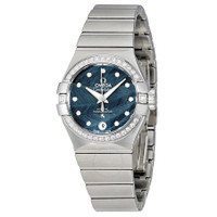 Silver-tone stainless steel case with a silver-tone stainless steel bracelet. Fixed silver-tone stainless steel set with diamonds bezel. Blue lacquered dial with luminous silver-tone dauphine-style shape hands and diamond hour markers. Dial Type: Analog. Luminescent hands and markers. Date display at the 6 o'clock position. Omega Calibre 8520 Automatic movement, based upon Omega 8500, containing 28 Jewels, bitting at 25200 vph, and has a power reserve of approximately 50 hours. Scratch resistant sapphire crystal. Screw down crown. Transparent case back. Round case shape, case size: 27 mm, case thickness: 9 mm. Band width: 18 mm. Fold over clasp. Water resistant at 50 meters / 165 feet. Functions: date, hour, minute, second, chronometer. Luxury watch style. Watch label: Swiss Made. Omega Constellation Automatic Ladies Watch 123.15.27.20.53.001. INFORMATION Brand: Omega Series: Constellation Collection Name: Constellation Gender: Womens Model: 123.15.27.20.53.001 Watch Label: Swiss Made Movement: Automatic Engine: Omega Calibre 8520 Power Reserve: 50 hours CASE Case Size: 27 mm Case Thickness: 9 mm Case Material: Stainless Steel Case Shape: Round Case Back: Transparent BAND Band Material: Stainless Steel Band Type: Bracelet Band Color: Silver-tone Band Width: 18 mm Clasp: Fold Over DIAL Dial Color: Blue Lacquered Type: Analog Crystal: Scratch Resistant Sapphire Hands: Luminous Silver-tone Dauphine-style shape Dial Markers: Diamond Luminiscence: Hands and Markers Bezel: Fixed Bezel Color: Silver-tone Bezel Material: Stainless Steel set with Diamonds Crown: Screw Down FEATURES Water Resistance: 50 meters / 165 feet Calendar: Date display at the 6 o'clock position Functions: Date, Hour, Minute, Second, Chronometer Watch Features: Diamond, Stainless Steel, Chronometer, Analog ADDITIONAL INFO Watch Style: Luxury Warranty: 4 Year Jomashop Warranty UPC Code: 7612586262548 Jomashop Sku: OM12315272053001 Department: Watches Category: Watches
