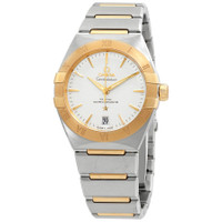 Stainless steel case with a stainless steel bracelet with 18kt yellow gold accents. Fixed 18kt yellow gold bezel. Silver dial with luminous yellow gold hands and index hour markers. Minute markers around the outer rim. Dial Type: Analog. Luminescent hands. Date display at the 6 o'clock position. Omega calibre 8800 automatic movement, containing 35 Jewels, bitting at 25200 vph, and has a power reserve of approximately 55 hours. Scratch resistant sapphire crystal. Pull / push crown. Transparent case back. Round case shape. Case size: 36 mm. Band width: 22.2 mm. Fold over clasp with a push button release. Water resistant at 50 meters / 165 feet. Functions: date, hour, minute, second. Constellation Automatic Series. Luxury watch style. Watch label: Swiss Made. Omega Constellation Automatic Silver Dial Ladies Watch 13120362002002. INFORMATION Brand: Omega Series: Constellation Automatic Collection Name: Constellation Automatic Gender: Womens Model: 13120362002002 Watch Label: Swiss Made Movement: Automatic Engine: Omega Calibre 8800 Power Reserve: 55 hours CASE Case Size: 36 mm Case Material: Stainless Steel Case Shape: Round Case Back: Transparent BAND Band Material: Stainless Steel with 18kt Yellow Gold Accents Band Type: Bracelet Band Color: Silver-tone Band Width: 22.2 mm Clasp: Fold Over with Push Button Release DIAL Dial Color: Silver Type: Analog Crystal: Scratch Resistant Sapphire Hands: Luminous Yellow Gold Dial Markers: Index Second Markers: Minute Markers around the outer rim Luminiscence: Hands Bezel: Fixed Bezel Material: 18kt Yellow Gold Crown: Pull / Push FEATURES Water Resistance: 50 meters / 165 feet Calendar: Date display at the 6 o'clock position Functions: Date, Hour, Minute, Second Watch Features: Stainless Steel, Gold, Analog ADDITIONAL INFO Watch Style: Luxury Warranty: 4 Year Jomashop Warranty UPC Code: 785449194731 Jomashop Sku: OM13120362002002 Department: Watches Category: Watches