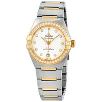 Silver-tone stainless steel case with a two-tone (silver-tone and gold-tone) stainless steel with 18kt yellow gold links bracelet. Fixed 18kt yellow gold set with diamonds bezel. Silver dial with yellow gold-tone skeleton alpha-style shape hands and diamond hour markers. Dial Type: Analog. Date display at the 6 o'clock position. Omega Calibre 8700 automatic movement with a 50-hour power reserve. Scratch resistant sapphire crystal. Pull / push crown. Transparent case back. Round case shape, case size: 29 mm. Band width: 17.6 mm. Push button fold over clasp. Water resistant at 50 meters / 165 feet. Functions: date, hour, minute, second,chronometer,co-axial escapement. Constellation Manhattan Series. Dress watch style. Watch label: Swiss Made. Omega Constellation Manhattan Automatic Chronometer Diamond Silver Dial Ladies Watch 131.25.29.20.52.002. INFORMATION Brand: Omega Series: Constellation Manhattan Collection Name: Constellation Manhattan Gender: Womens Model: 131.25.29.20.52.002 Watch Label: Swiss Made Movement: Automatic Engine: Omega Calibre 8700 Power Reserve: 50 hours CASE Case Size: 29 mm Case Material: Stainless Steel Case Shape: Round Case Back: Transparent BAND Band Material: Stainless Steel with 18kt Yellow Gold Links Band Type: Bracelet Band Color: Two-tone (Silver-tone and Gold-tone) Band Width: 17.6 mm Clasp: Push Button Fold Over DIAL Dial Color: Silver Type: Analog Crystal: Scratch Resistant Sapphire Hands: Yellow Gold-tone Skeleton Alpha-style shape Dial Markers: Diamond Bezel: Fixed Bezel Color: Gold-tone Bezel Material: 18kt Yellow Gold set with Diamonds Crown: Pull / Push FEATURES Water Resistance: 50 meters / 165 feet Calendar: Date display at the 6 o'clock position Functions: Date, Hour, Minute, Second,Chronometer,Co-Axial Escapement Watch Features: Diamond, Stainless Steel, Gold, Chronometer, Analog ADDITIONAL INFO Watch Style: Dress Warranty: 4 Year Jomashop Warranty UPC Code: 7612586283796 Jomashop Sku: OM13125292052002 Department: Watches Category: Watches