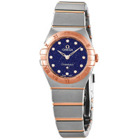 Stainless steel case with a stainless steel bracelet with 18kt sedna gold bars. Fixed 18kt sedna gold bezel. Blue (aventurine) dial with rose gold-tone skeleton hands and diamond hour markers. Dial Type: Analog. Omega calibre 4061 quartz movement. Scratch resistant sapphire crystal. Solid case back. Round case shape. Case size: 25 mm. Band width: 15.9 mm. Push button fold over clasp. Water resistant at 30 meters / 100 feet. Functions: hour, minute. Dress watch style. Watch label: Swiss Made. Omega Constellation Quartz Diamond Blue Dial Ladies Watch 131.20.25.60.53.002. INFORMATION Brand: Omega Series: Constellation Collection Name: Constellation Gender: Womens Model: 131.20.25.60.53.002 Watch Label: Swiss Made Movement: Quartz Engine: Omega Calibre 4061 CASE Case Size: 25 mm Case Material: Stainless Steel Case Shape: Round Case Back: Solid BAND Band Material: Stainless Steel with 18kt Sedna Gold Bars Band Type: Bracelet Band Color: Two-tone (Silver-tone and Rose Gold-tone) Band Width: 15.9 mm Clasp: Push Button Fold Over DIAL Dial Color: Blue (Aventurine) Type: Analog Crystal: Scratch Resistant Sapphire Hands: Rose Gold-tone Skeleton Dial Markers: Diamond Bezel: Fixed Bezel Color: Rose Gold-tone Bezel Material: 18kt Sedna Gold FEATURES Water Resistance: 30 meters / 100 feet Functions: Hour, Minute Watch Features: Diamond, Stainless Steel, Gold, Analog ADDITIONAL INFO Watch Style: Dress Warranty: 4 Year Jomashop Warranty UPC Code: 7612586301438 Jomashop Sku: OM13120256053002 Department: Watches Category: Watches