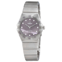 Silver-tone stainless steel case and bracelet. Fixed silver-tone stainless steel bezel. Purple dial with silver-tone hands and diamond hour markers. Dial Type: Analog. Omega Calibre 4061 quartz movement. Scratch resistant sapphire crystal. Pull / push crown. Solid case back. Round case shape, case size: 28 mm. Band width: 17.5 mm. Water resistant at 30 meters / 100 feet. Functions: hour, minute. Constellation Series. Luxury watch style. Watch label: Swiss Made. Omega Constellation Quartz Diamond Purple Dial Ladies Watch 131.10.28.60.60.002. INFORMATION Brand: Omega Series: Constellation Collection Name: Constellation Gender: Womens Model: 131.10.28.60.60.002 Watch Label: Swiss Made Movement: Quartz Engine: Omega Calibre 4061 CASE Case Size: 28 mm Case Material: Stainless Steel Case Shape: Round Case Back: Solid BAND Band Material: Stainless Steel Band Type: Bracelet Band Color: Silver-tone Band Width: 17.5 mm DIAL Dial Color: Purple Type: Analog Crystal: Scratch Resistant Sapphire Hands: Silver-tone Dial Markers: Diamond Bezel: Fixed Bezel Color: Silver-tone Bezel Material: Stainless Steel Crown: Pull / Push FEATURES Water Resistance: 30 meters / 100 feet Functions: Hour, Minute Watch Features: Diamond, Stainless Steel, Analog ADDITIONAL INFO Watch Style: Luxury Warranty: 2 Year Jomashop Warranty Jomashop Sku: OM13110286060002 Department: Watches Category: Watches