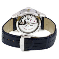 Stainless steel case with a blue (alligator) leather strap. Fixed stainless steel bezel. Blue dial with silver-tone hands and index hour markers. Arabic numeral minute markers (at 5 minute intervals). Minute markers around the outer rim. Dial Type: Analog. Month and date display at the 3 o'clock position. Omega calibre 8601 automatic movement, based upon Omega 8500, containing 39 Jewels, bitting at 25200 vph, and has a power reserve of approximately 55 hours. Scratch resistant sapphire crystal. Pull / push crown. Transparent case back. Round case shape. Case size: 41 mm. Case thickness: 13 mm. Band width: 20 mm. Band length: 7 inches. Fold over clasp with a push button release. Water resistant at 100 meters / 330 feet. Functions: annual calendar, month, date, hour, minute, second, chronometer. De Ville Annual Calendar Series. Luxury watch style. Watch label: Swiss Made. Omega De Ville Annual Calendar Automatic Chronometer Blue Dial Men's Watch 43133412203001. INFORMATION Brand: Omega Series: De Ville Annual Calendar Collection Name: De Ville Annual Calendar Gender: Mens Model: 431.33.41.22.03.001 Watch Label: Swiss Made Movement: Automatic Engine: Omega Calibre 8601 Power Reserve: 55 hours CASE Case Size: 41 mm Case Thickness: 13 mm Case Material: Stainless Steel Case Shape: Round Case Back: Transparent BAND Band Material: (Alligator) Leather Band Type: Strap Band Color: Blue Band Length: 7 inches Band Width: 20 mm Clasp: Fold Over with Push Button Release DIAL Dial Color: Blue Type: Analog Crystal: Scratch Resistant Sapphire Hands: Silver-tone Dial Markers: Index Second Markers: Arabic Numeral Minute Markers (at 5 minute intervals). Minute Markers around the outer rim Bezel: Fixed Bezel Color: Silver-tone Bezel Material: Stainless Steel Crown: Pull / Push FEATURES Water Resistance: 100 meters / 330 feet Calendar: Month and Date display at the 3 o'clock position Functions: Annual Calendar, Month, Date, Hour, Minute, Second, Chronometer Watch Features: Month, Alligator Leather, Analog, Annual Calendar, Chronometer, Leather, Stainless Steel ADDITIONAL INFO Watch Style: Luxury Warranty: 4 Year Jomashop Warranty UPC Code: 7612586243820 Jomashop Sku: OM43133412203001 Department: Watches Category: Watches