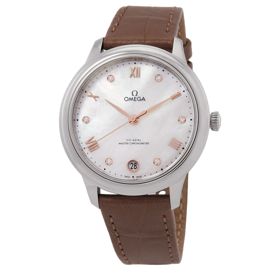 Silver-tone stainless steel case with a brown alligator band. Fixed silver-tone stainless steel bezel. White dial with rose gold-tone hands and diamond hour markers. Minute markers around the outer rim. Dial Type: Analog. Date display at the 6 o'clock position. Omega Calibre 8800 Automatic movement, containing 35 Jewels, bitting at 25200 vph, and has a power reserve of approximately 55 hours. Scratch resistant sapphire crystal. Transparent see through case back. Round case shape, case size: 34 mm. Water resistant at 30 meters / 100 feet. Functions: date, hour, minute, second, co-axial escapement, chronometer, magnetic resistant. Additional Info: original box, international warranty card, manual (complete accessories). De Ville Series. Luxury watch style. Watch label: Swiss Made. Omega De Ville Automatic Chronometer Diamond White Dial Ladies Watch 434.13.34.20.55.001. GENERAL Box Type: Original Box CASE Case Diameter: 34 mm Case Material: Stainless Steel Case Shape: Round Case Back: Transparent See Through BAND Band Material: Alligator Band Type: Strap Band Color: Brown DIAL Dial Color: White Type: Analog Crystal: Scratch Resistant Sapphire Hands: Rose Gold-tone Dial Markers: Diamond Second Markers: Minute Markers around the outer rim Bezel: Fixed Bezel Color: Silver-tone Bezel Material: Stainless Steel INFORMATION Brand: Omega Series: De Ville Collection Name: De Ville Gender: Womens Model: 434.13.34.20.55.001 Watch Label: Swiss Made Movement: Automatic Engine: Omega Calibre 8800 Power Reserve: 55 hours FEATURES Water Resistance: 30 meters / 100 feet Calendar: Date display at the 6 o'clock position Functions: Date, Hour, Minute, Second, Co-Axial Escapement, Chronometer, Magnetic Resistant Watch Features: Alligator Leather, Analog, Chronometer, Gold, Stainless Steel, Diamond ADDITIONAL INFO Watch Style: Luxury Warranty: 2 Year Jomashop Warranty Additional Info: Original Box, Manual (Complete Accessories) Jomashop Sku: OM43413342055001 Department: Watches Category: Watches