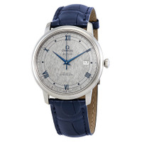 Silver-tone stainless steel case with a blue leather strap. Fixed silver-tone stainless steel bezel. Grey dial with blue dauphine-style hands and alternating Roman numeral and dot hour markers. Minute markers around the outer rim. Dial Type: Analog. Date display at the 3 o'clock position. Omega Calibre 2500 Automatic movement, based upon ETA 2892-A2, containing 27 Jewels, bitting at 25200 vph, and has a power reserve of approximately 48 hours. Scratch resistant sapphire crystal. Pull / push crown. Solid case back. Round case shape, case size: 39.5 mm. Band width: 20 mm. Tang clasp. Water resistant at 30 meters / 100 feet. Functions: date, hour, minute, second, co-axial escapement, chronometer. De Ville Series. Dress watch style. Watch label: Swiss Made. Omega De Ville Automatic Grey Dial Men's Watch 424.13.40.20.06.002. INFORMATION Brand: Omega Series: De Ville Collection Name: De Ville Gender: Mens Model: 424.13.40.20.06.002 Watch Label: Swiss Made Movement: Automatic Engine: Omega Calibre 2500 Power Reserve: 48 hours CASE Case Size: 39.5 mm Case Material: Stainless Steel Case Shape: Round Case Back: Solid BAND Band Material: Leather Band Type: Strap Band Color: Blue Band Width: 20 mm Clasp: Tang DIAL Dial Color: Grey Type: Analog Crystal: Scratch Resistant Sapphire Hands: Blue Dauphine-style Dial Markers: Alternating Roman Numeral and Dot Second Markers: Minute Markers around the outer rim Bezel: Fixed Bezel Color: Silver-tone Bezel Material: Stainless Steel Crown: Pull / Push FEATURES Water Resistance: 30 meters / 100 feet Calendar: Date display at the 3 o'clock position Functions: Date, Hour, Minute, Second, Co-Axial Escapement, Chronometer Watch Features: Stainless Steel, Leather, Chronometer, Analog ADDITIONAL INFO Watch Style: Dress Warranty: 4 Year Jomashop Warranty UPC Code: 7612586285738 Jomashop Sku: OM42413402006002 Department: Watches Category: Watches