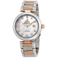 Stainless steel and 18kt sedna gold case with a two-tone (silver-tone and gold-tone) stainless steel and 18kt sedna gold bracelet. Fixed silver-tone stainless steel bezel. Mother of pearl dial with rose gold-tone alpha-style shape hands and diamond hour markers. Dial Type: Analog. Date display at the 3 o'clock position. Omega Calibre 8520 Automatic movement, based upon Omega 8500, containing 28 Jewels, bitting at 25200 vph, and has a power reserve of approximately 50 hours. Scratch resistant sapphire crystal. Screw down crown. Transparent case back. Round case shape. Case size: 34 mm. Band width: 16 mm. Deploymen clasp. Water resistant at 100 meters / 330 feet. Functions: date, hour, minute, second. Luxury watch style. Watch label: Swiss Made. Omega De Ville Automatic Ladies Steel and 18K Sedna Gold Watch 425.20.34.20.55.004. GENERAL Box Type: Original Box CASE Case Size: 34 Case Material: Stainless Steel and 18kt Sedna Gold Case Shape: Round Case Back: Transparent BAND Band Material: Stainless Steel and 18kt Sedna Gold Band Type: Bracelet Band Color: Two-tone (Silver-tone and Gold-tone) Band Width: 16 mm Clasp: Deploymen DIAL Dial Color: Mother Of Pearl Type: Analog Crystal: Scratch Resistant Sapphire Hands: Rose Gold-tone Alpha-style shape Dial Markers: Diamond Bezel: Fixed Bezel Color: Silver-tone Bezel Material: Stainless Steel Crown: Screw Down INFORMATION Brand: Omega Series: De Ville Collection Name: De Ville Gender: Womens Model: 425.20.34.20.55.004 Watch Label: Swiss Made Movement: Automatic Engine: Omega Calibre 8520 Power Reserve: 50 hours FEATURES Water Resistance: 100 meters / 330 feet Calendar: Date display at the 3 o'clock position Functions: Date, Hour, Minute, Second Watch Features: Analog, Gold, Stainless Steel, Diamond ADDITIONAL INFO Watch Style: Luxury Warranty: 4 Year Jomashop Warranty UPC Code: 611393823468 Jomashop Sku: OM42520342055004 Department: Watches Category: Watches