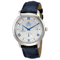 Stainless steel case with a blue (alligator) leather strap. Fixed silver-tone stainless steel bezel. Grey dial with blue dauphine-style shape hands and alternating Roman numeral and dot hour markers. Minute markers around the outer rim. Dial Type: Analog. Date display at the 3 o'clock position. Two sub-dials displaying: 60 second and power reserve indicator. Omega calibre 2627 automatic movement, based upon Omega 2500, containing 29 Jewels, bitting at 25200 vph, and has a power reserve of approximately 48 hours. Scratch resistant sapphire crystal. Pull / push crown. Solid case back. Round case shape. Case size: 39.5 mm. Band width: 20 mm. Tang clasp. Water resistant at 30 meters / 100 feet. Functions: date, hour, minute, second, power reserve indicator, co-axial escapement, chronometer. De Ville Series. Luxury watch style. Watch label: Swiss Made. Omega De Ville Automatic Men's Watch 424.13.40.21.02.003. GENERAL Box Type: Original Box CASE Case Size: 39 Case Material: Stainless Steel Case Shape: Round Case Back: Solid BAND Band Material: (Alligator) Leather Band Type: Strap Band Color: Blue Band Width: 20 mm Clasp: Tang DIAL Dial Color: Grey Type: Analog Crystal: Scratch Resistant Sapphire Hands: Blue Dauphine-style shape Dial Markers: Alternating Roman Numeral and Dot Second Markers: Minute Markers around the outer rim Sub Dials: Two -60 Second and Power Reserve Indicator Bezel: Fixed Bezel Color: Silver-tone Bezel Material: Stainless Steel Crown: Pull / Push INFORMATION Brand: Omega Series: De Ville Collection Name: De Ville Gender: Mens Model: 424.13.40.21.02.003 Watch Label: Swiss Made Movement: Automatic Engine: Omega Calibre 2627 Power Reserve: 48 hours FEATURES Water Resistance: 30 meters / 100 feet Calendar: Date display at the 3 o'clock position Functions: Date, Hour, Minute, Second, Power Reserve Indicator, Co-Axial Escapement, Chronometer Watch Features: Alligator Leather, Analog, Power Reserve Indicator, Chronometer, Leather, Stainless Steel ADDITIONAL INFO Watch Style: Luxury Warranty: 4 Year Jomashop Warranty UPC Code: 7612586262227 Jomashop Sku: OM42413402102003 Department: Watches Category: Watches