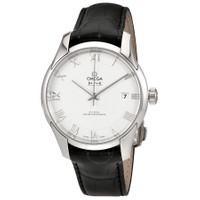 Stainless steel case with a black (alligator) leather strap. Fixed stainless steel bezel. Silver dial with silver-tone hands and Roman numeral hour markers. Dial Type: Analog. Date display at the 3 o'clock position. Omega calibre 8900 automatic movement, based upon Omega 8500, containing 39 Jewels, bitting at 25200 vph, and has a power reserve of approximately 60 hours. Scratch resistant sapphire crystal. Pull / push crown. Transparent case back. Round case shape. Case size: 41 mm. Band width: 20 mm. Deployment clasp. Water resistant at 100 meters / 330 feet. Functions: date, hour, minute, second. De Ville Series. Luxury watch style. Watch label: Swiss Made. Omega De Ville Automatic Silver Dial Men's Watch 433.13.41.21.02.001. INFORMATION Brand: Omega Series: De Ville Collection Name: De Ville Gender: Mens Model: 433.13.41.21.02.001 Watch Label: Swiss Made Movement: Automatic Engine: Omega Calibre 8900 Power Reserve: 60 hours CASE Case Size: 41 mm Case Material: Stainless Steel Case Shape: Round Case Back: Transparent BAND Band Material: (Alligator) Leather Band Type: Strap Band Color: Black Band Width: 20 mm Clasp: Deployment DIAL Dial Color: Silver Type: Analog Crystal: Scratch Resistant Sapphire Hands: Silver-tone Dial Markers: Roman Numeral Bezel: Fixed Bezel Color: Silver-tone Bezel Material: Stainless Steel Crown: Pull / Push FEATURES Water Resistance: 100 meters / 330 feet Calendar: Date display at the 3 o'clock position Functions: Date, Hour, Minute, Second Watch Features: Stainless Steel, Leather, Analog, Alligator Leather ADDITIONAL INFO Watch Style: Luxury Warranty: 4 Year Jomashop Warranty UPC Code: 7612586257308 Jomashop Sku: OM43313412102001 Department: Watches Category: Watches