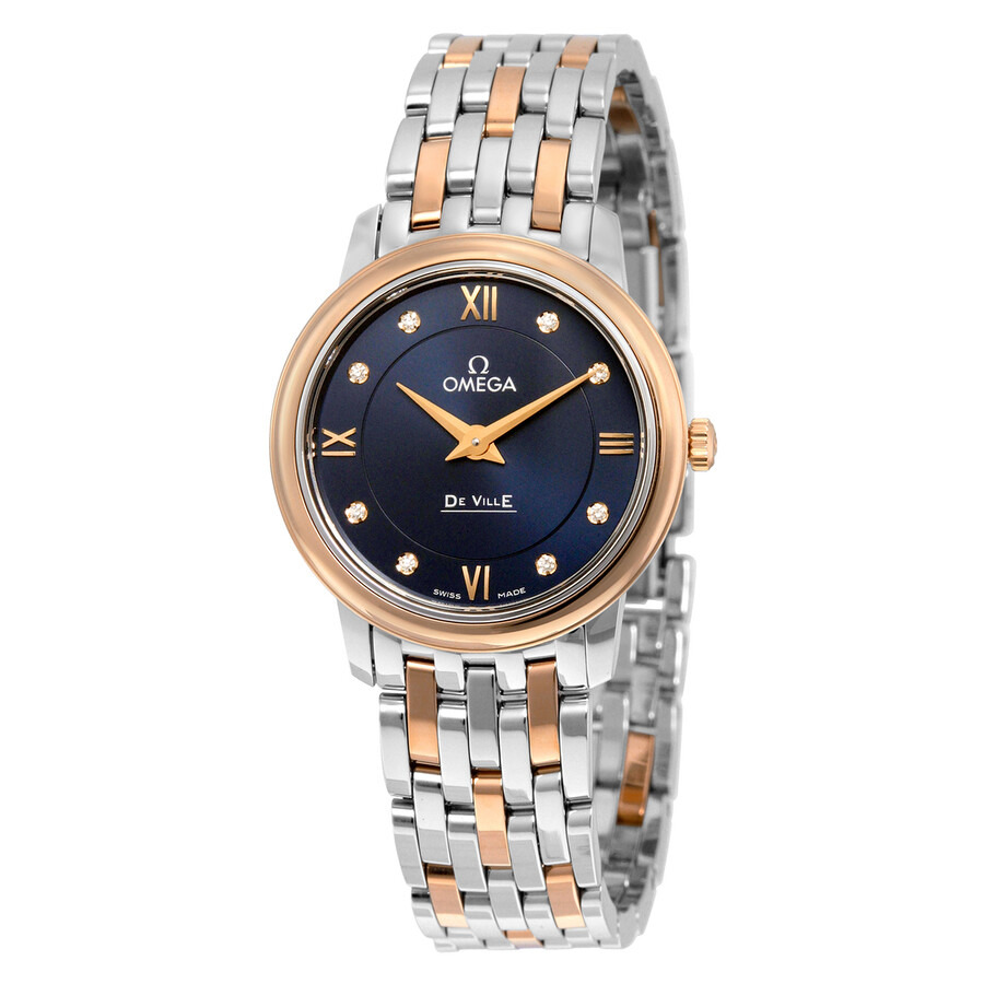 Silver-tone stainless steel case with a two-tone (silver-tone and gold-tone) stainless steel and 18kt rose gold bracelet. Fixed 18kt rose gold bezel. Blue dial with rose gold-tone dauphine-style shape hands and diamond hour markers. Roman numerals mark the 3, 6, 9 and 12 o'clock positions. Dial Type: Analog. Omega Calibre 1376 quartz movement with a 48 months power reserve. Scratch resistant sapphire crystal. Pull / push crown. Solid case back. Round case shape, case size: 27.4 mm. Band width: 14 mm, band length: 7 inches. Deployment clasp. Water resistant at 30 meters / 100 feet. Functions: hour, minute. De Ville Series. Luxury watch style. Watch label: Swiss Made. Omega De Ville Blue Diamond Dial Steel and 18K Rose Gold Ladies Watch 424.20.27.60.53.001. INFORMATION Brand: Omega Series: De Ville Collection Name: De Ville Gender: Womens Model: 424.20.27.60.53.001 Watch Label: Swiss Made Movement: Quartz Engine: Omega Calibre 1376 Power Reserve: 48 months CASE Case Size: 27.4 mm Case Material: Stainless Steel Case Shape: Round Case Back: Solid BAND Band Material: Stainless Steel and 18kt Rose Gold Band Type: Bracelet Band Color: Two-tone (Silver-tone and Gold-tone) Band Length: 7 inches Band Width: 14 mm Clasp: Deployment DIAL Dial Color: Blue Type: Analog Crystal: Scratch Resistant Sapphire Hands: Rose Gold-tone Dauphine-style shape Dial Markers: Diamond Second Markers: Roman Numerals mark the 3, 6, 9 and 12 o'clock positions Bezel: Fixed Bezel Material: 18kt Rose Gold Crown: Pull / Push FEATURES Water Resistance: 30 meters / 100 feet Functions: Hour, Minute Watch Features: Diamond, Stainless Steel, Gold, Month, Analog ADDITIONAL INFO Watch Style: Luxury Warranty: 4 Year Jomashop Warranty UPC Code: 7612586253201 Jomashop Sku: OM42420276053001 Department: Watches Category: Watches