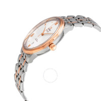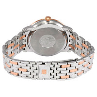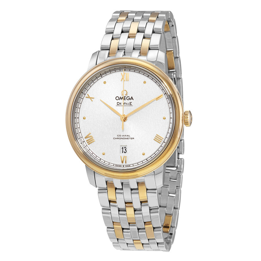Stainless steel case with a stainless steel bracelet with 18kt rose gold links. Fixed 18kt rose gold bezel. Silver dial with rose gold-tone hands and alternating dot and Roman numeral hour markers. Minute markers around the outer rim. Dial Type: Analog. Date display above the 6 o'clock position. Omega caliber 2500 automatic movement, based upon ETA 2892, containing 27 Jewels, bitting at 25200 vph, and has a power reserve of approximately 48 hours. Scratch resistant sapphire crystal. Pull / push crown. Solid case back. Round case shape. Case size: 39.5 mm. Band width: 20 mm. Fold over clasp with a safety release. Water resistant at 30 meters / 100 feet. Functions: date, hour, minute, co-axial escapement, chronometer, shock resistant. De Ville Prestige Series. Luxury watch style. Watch label: Swiss Made. Omega De Ville Prestige Automatic Chronometer Silver Dial Men's Watch 424.20.40.20.02.007. GENERAL Box Type: Original Box CASE Case Size: 39 Case Material: Stainless Steel Case Shape: Round Case Back: Solid BAND Band Material: Stainless Steel with 18kt Rose Gold Links Band Type: Bracelet Band Color: Silver-tone Band Width: 20 mm Clasp: Fold Over with Safety Release DIAL Dial Color: Silver Type: Analog Crystal: Scratch Resistant Sapphire Hands: Rose Gold-tone Dial Markers: Alternating Dot and Roman Numeral Second Markers: Minute Markers around the outer rim Bezel: Fixed Bezel Material: 18kt Rose Gold Crown: Pull / Push INFORMATION Brand: Omega Series: De Ville Collection Name: De Ville Prestige Gender: Mens Model: 424.20.40.20.02.007 Watch Label: Swiss Made Movement: Automatic Engine: Omega Caliber 2500 Power Reserve: 48 hours FEATURES Water Resistance: 30 meters / 100 feet Calendar: Date display above the 6 o'clock position Functions: Date, Hour, Minute, Co-Axial Escapement, Chronometer, Shock Resistant Watch Features: Analog, Chronometer, Gold, Stainless Steel ADDITIONAL INFO Watch Style: Luxury Warranty: 2 Year Jomashop Warranty Jomashop Sku: OM42420402002007 Department: Watches Category: Watches