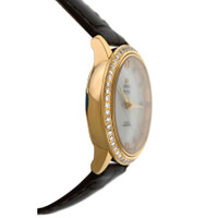 18kt yellow gold case with a brown leather strap. Diamond set bezel. White mother of pearl dial with gold-tone hands and Roman numeral and diamond hour markers. Dial Type: Analog. Date display at the 3 o'clock position. Omega Calibre 2500 automatic movement with a 48-hour power reserve. Scratch resistant sapphire crystal. Case size: 32.7 mm. Round case shape. Band width: 16 mm. Water resistant at 30 meters / 100 feet. Functions: date, hour, minute, second, co-axial escapement, chronometer. Luxury watch style. Watch label: Swiss Made. Omega De Ville Prestige Automatic Ladies Watch 424.58.33.20.55.002. GENERAL Box Type: Original Box CASE Case Size: 32 Case Material: 18kt Yellow Gold Case Shape: Round BAND Band Material: Leather Band Type: Strap Band Color: Brown Band Width: 16 mm DIAL Dial Color: White Mother of Pearl Type: Analog Crystal: Scratch Resistant Sapphire Hands: Gold-tone Dial Markers: Roman Numeral and Diamond Bezel: Fixed Bezel Material: Diamond Set INFORMATION Brand: Omega Series: De Ville Collection Name: De Ville Prestige Gender: Womens Model: 424.58.33.20.55.002 Watch Label: Swiss Made Movement: Automatic Engine: Omega Calibre 2500 Power Reserve: 48 hours FEATURES Water Resistance: 30 meters / 100 feet Calendar: Date display at the 3 o'clock position Functions: Date, Hour, Minute, Second, Co-Axial Escapement, Chronometer Watch Features: Analog, Chronometer, Gold, Leather, Diamond ADDITIONAL INFO Watch Style: Luxury Warranty: 4 Year Jomashop Warranty UPC Code: 683498472834 Jomashop Sku: OM42458332055002 Department: Watches Category: Watches