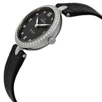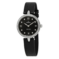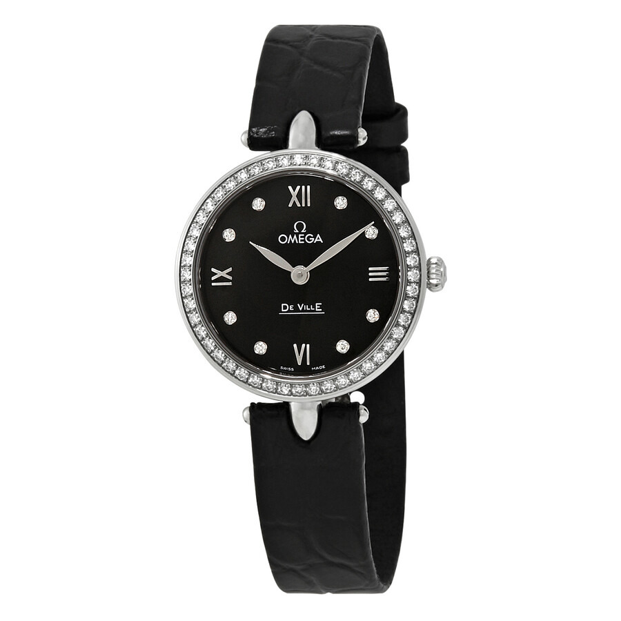 Silver-tone stainless steel case with a black crocodile leather strap. Fixed silver-tone diamond set bezel. Black dial with silver-tone leaf-style shape hands and diamond index hour markers. Roman numerals mark the 3, 6, 9 and 12 o'clock positions. Dial Type: Analog. Omega Calibre 4061 quartz movement with a 48 months power reserve. Scratch resistant sapphire crystal. Solid case back. Round case shape, case size: 27.4 mm. Tang clasp. Water resistant at 30 meters / 100 feet. Functions: hour, minute. De Ville Prestige Series. Luxury watch style. Watch label: Swiss Made. Omega De Ville Prestige Black Dial Black Leather Quartz Ladies Watch 424.18.27.60.51.001. INFORMATION Brand: Omega Series: De Ville Prestige Collection Name: De Ville Prestige Gender: Womens Model: 424.18.27.60.51.001 Watch Label: Swiss Made Movement: Quartz Engine: Omega Calibre 4061 Power Reserve: 48 months CASE Case Size: 27.4 mm Case Material: Stainless Steel Case Shape: Round Case Back: Solid BAND Band Material: Crocodile Leather Band Type: Strap Band Color: Black Clasp: Tang DIAL Dial Color: Black Type: Analog Crystal: Scratch Resistant Sapphire Hands: Silver-tone Leaf-style shape Dial Markers: Diamond Index Second Markers: Roman Numerals mark the 3, 6, 9 and 12 o'clock positions Bezel: Fixed Bezel Color: Silver-tone Bezel Material: Diamond Set FEATURES Water Resistance: 30 meters / 100 feet Functions: Hour, Minute Watch Features: Diamond, Stainless Steel, Leather, Month, Analog ADDITIONAL INFO Watch Style: Luxury Warranty: 4 Year Jomashop Warranty UPC Code: 7612586260285 Jomashop Sku: OM42418276051001 Department: Watches Category: Watches