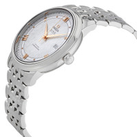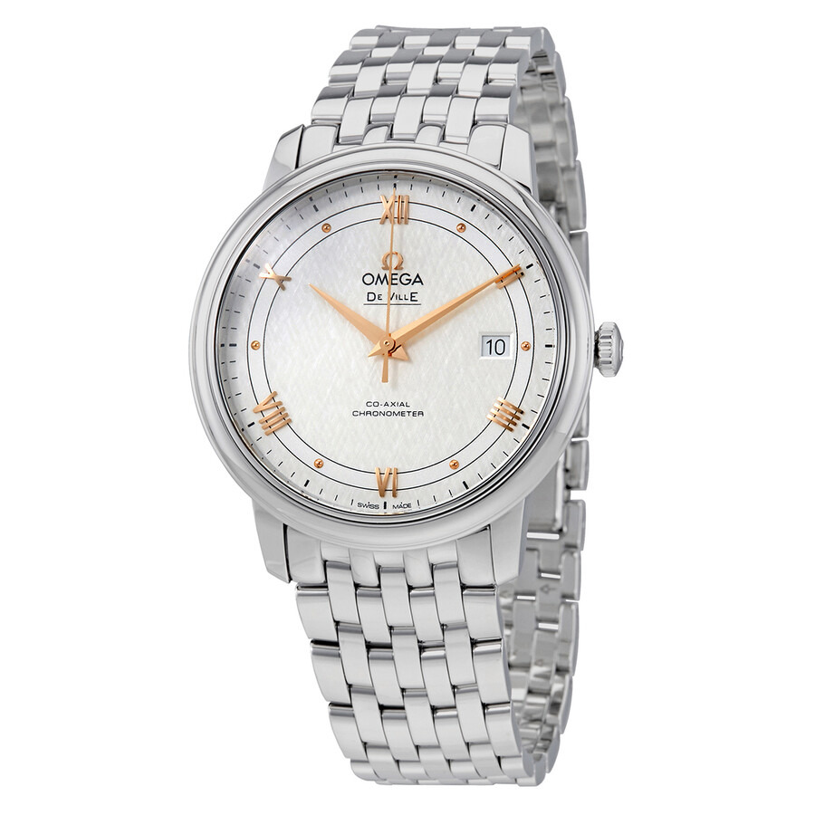 Stainless steel case with a stainless steel bracelet. Fixed stainless steel bezel. Silver dial with rose gold-tone dauphine-style hands and alternating Roman numeral and dot hour markers. Minute markers around the outer rim. Dial Type: Analog. Date display at the 3 o'clock position. Omega calibre 2500 automatic movement, based upon ETA 2892-A2, containing 27 Jewels, bitting at 25200 vph, and has a power reserve of approximately 48 hours. Scratch resistant sapphire crystal. Solid case back. Round case shape. Case size: 39.5 mm. Band width: 20 mm. Hidden fold over clasp. Water resistant at 30 meters / 100 feet. Functions: date, hour, minute, second, co-axial escapement, chronometer. De Ville Prestige Co-axial Series. Luxury watch style. Watch label: Swiss Made. Omega De Ville Prestige Co-Axial Silver Dial Men's Watch 424.10.40.20.02.004. INFORMATION Brand: Omega Series: De Ville Prestige Co-Axial Collection Name: De Ville Prestige Co-Axial Gender: Mens Model: 424.10.40.20.02.004 Watch Label: Swiss Made Movement: Automatic Engine: Omega Calibre 2500 Power Reserve: 48 hours CASE Case Size: 39.5 mm Case Material: Stainless Steel Case Shape: Round Case Back: Solid BAND Band Material: Stainless Steel Band Type: Bracelet Band Color: Silver-tone Band Width: 20 mm Clasp: Hidden Fold Over DIAL Dial Color: Silver Type: Analog Crystal: Scratch Resistant Sapphire Hands: Rose Gold-tone Dauphine-style Dial Markers: Alternating Roman Numeral and Dot Second Markers: Minute Markers around the outer rim Bezel: Fixed Bezel Color: Silver-tone Bezel Material: Stainless Steel FEATURES Water Resistance: 30 meters / 100 feet Calendar: Date display at the 3 o'clock position Functions: Date, Hour, Minute, Second, Co-Axial Escapement, Chronometer Watch Features: Stainless Steel, Gold, Chronometer, Analog ADDITIONAL INFO Watch Style: Luxury Warranty: 4 Year Jomashop Warranty UPC Code: 7612586270093 Jomashop Sku: OM42410402002004 Department: Watches Category: Watches