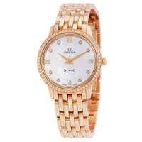 18kt rose gold case with a polished 18kt rose gold bracelet. Fixed bezel with diamond set. White mother-of-pearl dial with gold-tone hands and diamond and Roman numeral hour markers. Dial Type: Analog. Omega Calibre 1376 quartz movement. Scratch resistant sapphire crystal. Pull / push crown. Solid case back. Round case shape, case size: 27.4 mm. Band width: 14 mm. Push button folding clasp. Water resistant at 30 meters / 100 feet. Functions: hour, minute. De Ville Prestige Series. Luxury watch style. Watch label: Swiss Made. Omega De Ville Prestige Ladies Watch 424.55.27.60.55.002. CASE Case Size: 27 Case Material: 18kt Rose Gold Case Shape: Round Case Back: Solid BAND Band Material: 18kt Rose Gold Band Type: Bracelet Band Color: Polished Band Width: 14 mm Clasp: Push Button Folding Clasp DIAL Dial Color: White Mother-of-Pearl Type: Analog Crystal: Scratch Resistant Sapphire Hands: Gold-tone Dial Markers: Diamond and Roman Numeral Bezel: Fixed Bezel Material: Diamond set Crown: Pull / Push INFORMATION Brand: Omega Series: De Ville Collection Name: De Ville Prestige Gender: Womens Model: 424.55.27.60.55.002 Watch Label: Swiss Made Movement: Quartz Engine: Omega Calibre 1376 FEATURES Water Resistance: 30 meters / 100 feet Functions: Hour, Minute Watch Features: Analog, Gold, Diamond ADDITIONAL INFO Watch Style: Luxury Warranty: 4 Year Jomashop Warranty UPC Code: 683498472766 Jomashop Sku: OM42455276055002 Department: Watches Category: Watches