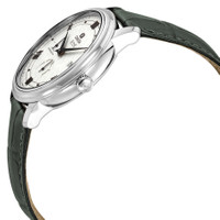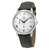 Stainless steel case with a hunter green (alligator) leather strap. Fixed stainless steel bezel. Silver dial with black hands and alternating Roman numeral and dot hour markers. Minute markers around the outer rim. Dial Type: Analog. Date display at the 3 o'clock position. Two sub-dials displaying: small second and power reserve indicator. Omega calibre 2627 automatic movement, based upon Omega 2500, containing 29 Jewels, bitting at 25200 vph, and has a power reserve of approximately 48 hours. Scratch resistant sapphire crystal. Push / pull crown. Solid case back. Round case shape. Case size: 39.5 mm. Band width: 20 mm. Tang clasp. Water resistant at 30 meters / 100 feet. Functions: date, hour, minute, second, power reserve. De Ville Prestige Series. Luxury watch style. Watch label: Swiss Made. Omega De Ville Prestige Silver Dial Men's Watch 424.13.40.21.02.004. GENERAL Box Type: Original Box CASE Case Size: 39 Case Material: Stainless Steel Case Shape: Round Case Back: Solid BAND Band Material: (Alligator) Leather Band Type: Strap Band Color: Hunter Green Band Width: 20 mm Clasp: Tang DIAL Dial Color: Silver Type: Analog Crystal: Scratch Resistant Sapphire Hands: Black Dial Markers: Alternating Roman Numeral and Dot Second Markers: Minute Markers around the outer rim Sub Dials: Two - Small Second and Power Reserve Indicator Bezel: Fixed Bezel Color: Silver-tone Bezel Material: Stainless Steel Crown: Pull / Push INFORMATION Brand: Omega Series: De Ville Collection Name: De Ville Prestige Gender: Mens Model: 424.13.40.21.02.004 Watch Label: Swiss Made Movement: Automatic Engine: Omega Calibre 2627 Power Reserve: 48 hours FEATURES Water Resistance: 30 meters / 100 feet Calendar: Date display at the 3 o'clock position Functions: Date, Hour, Minute, Second, Power Reserve Watch Features: Alligator Leather, Analog, Power Reserve Indicator, Leather, Stainless Steel ADDITIONAL INFO Watch Style: Luxury Warranty: 4 Year Jomashop Warranty UPC Code: 7612586286339 Jomashop Sku: OM42413402102004 Department: Watches Category: Watches
