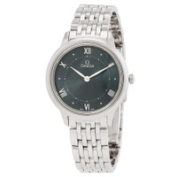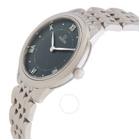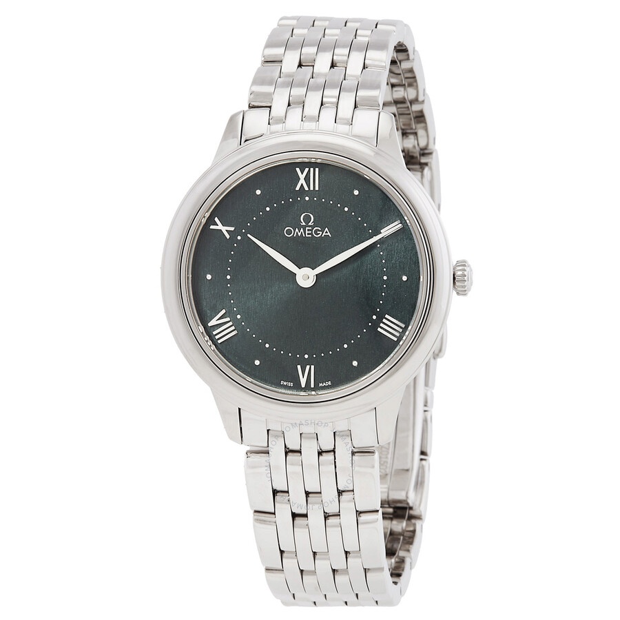 Silver-tone stainless steel case and bracelet. Fixed silver-tone stainless steel bezel. Green dial with silver-tone hands and Roman numeral hour markers. Minute markers around the outer rim. Dial Type: Analog. Omega Calibre 4061 quartz movement. Scratch resistant sapphire crystal. Solid case back. Round case shape, case size: 30 mm. Fold over clasp with a safety release. Water resistant at 30 meters / 100 feet. Functions: hour, minute. Additional Info: original box, international warranty card, manual (complete accessories). De Ville Series. Luxury watch style. Watch label: Swiss Made. Omega De Ville Quartz Green Dial Ladies Watch 434.10.30.60.10.001. CASE Case Size: 30 Case Material: Stainless Steel Case Shape: Round Case Back: Solid BAND Band Material: Stainless Steel Band Type: Bracelet Band Color: Silver-tone Clasp: Fold Over with Safety Release DIAL Dial Color: Green Type: Analog Crystal: Scratch Resistant Sapphire Hands: Silver-tone Dial Markers: Roman Numeral Second Markers: Minute Markers around the outer rim Bezel: Fixed Bezel Color: Silver-tone Bezel Material: Stainless Steel INFORMATION Brand: Omega Series: De Ville Collection Name: De Ville Gender: Womens Model: 434.10.30.60.10.001 Watch Label: Swiss Made Movement: Quartz Engine: Omega Calibre 4061 FEATURES Water Resistance: 30 meters / 100 feet Functions: Hour, Minute Watch Features: Stainless Steel, Analog ADDITIONAL INFO Watch Style: Luxury Warranty: 2 Year Jomashop Warranty Additional Info: Original Box, Manual (Complete Accessories) Jomashop Sku: OM43410306010001 Department: Watches Category: Watches