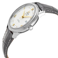 Stainless steel case with a grey (alligator) leather strap. Fixed stainless steel bezel. Silver dial with rose gold-tone dauphine-style hands and alternating dot and Roman numerals hour markers. Minute markers around the outer rim. Dial Type: Analog. Date display at the 3 o'clock position. Omega calibre 2500 automatic movement, based upon ETA 2892-A2, containing 27 Jewels, bitting at 25200 vph, and has a power reserve of approximately 48 hours. Scratch resistant sapphire crystal. Push / pull crown. Solid case back. Round case shape. Case size: 39.5 mm. Band width: 20 mm. Tang clasp. Water resistant at 30 meters / 100 feet. Functions: date, hour, minute, second, co-axial escapement, chronometer. Dress watch style. Watch label: Swiss Made. Omega De Ville Silver Dial Automatic Men's Watch 424.13.40.20.02.005. INFORMATION Brand: Omega Series: De Ville Collection Name: De Ville Gender: Mens Model: 424.13.40.20.02.005 Watch Label: Swiss Made Movement: Automatic Engine: Omega Calibre 2500 Power Reserve: 48 hours CASE Case Size: 39.5 mm Case Material: Stainless Steel Case Shape: Round Case Back: Solid BAND Band Material: (Alligator) Leather Band Type: Strap Band Color: Grey Band Width: 20 mm Clasp: Tang DIAL Dial Color: Silver Type: Analog Crystal: Scratch Resistant Sapphire Hands: Rose Gold-tone Dauphine-style Dial Markers: Alternating Dot and Roman Numerals Second Markers: Minute Markers around the outer rim Bezel: Fixed Bezel Color: Silver-tone Bezel Material: Stainless Steel Crown: Pull / Push FEATURES Water Resistance: 30 meters / 100 feet Calendar: Date display at the 3 o'clock position Functions: Date, Hour, Minute, Second, Co-Axial Escapement, Chronometer Watch Features: Alligator Leather, Analog, Chronometer, Gold, Leather, Stainless Steel ADDITIONAL INFO Watch Style: Dress Warranty: 4 Year Jomashop Warranty UPC Code: 7612586270109 Jomashop Sku: OM42413402002005 Department: Watches Category: Watches