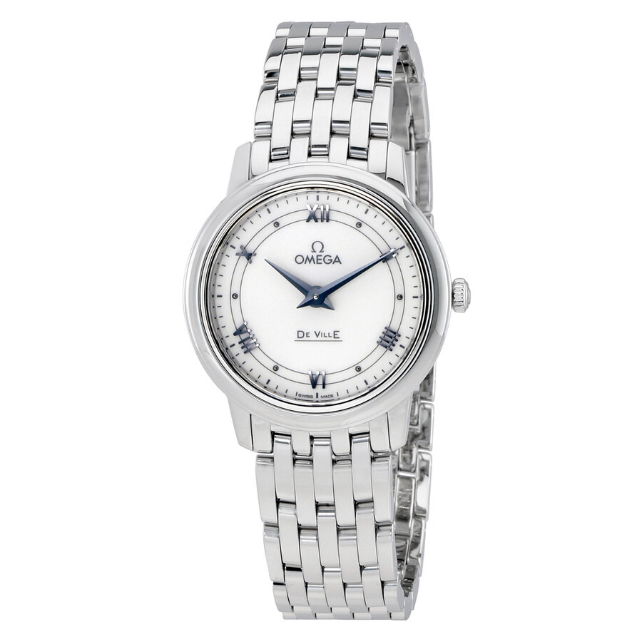 Stainless steel case with a stainless steel bracelet. Fixed stainless steel bezel. Silver dial with grey hands and alternating Roman numeral and dot hour markers. Minute markers around the outer rim. Dial Type: Analog. Omega calibre 1376 quartz movement. Scratch resistant sapphire crystal. Pull / push crown. Solid case back. Case size: 27.4 mm. Round case shape. Bracelet width: 14 mm. Fold over clasp. Water resistant at 30 meters / 100 feet. Functions: hour, minute. Luxury watch style. Watch label: Swiss Made. Omega De Ville Ladies Watch 424.10.27.60.04.001. INFORMATION Brand: Omega Series: De Ville Collection Name: De Ville Gender: Womens Model: 424.10.27.60.04.001 Watch Label: Swiss Made Movement: Quartz Engine: Omega Calibre 1376 Power Reserve: 48 months CASE Case Size: 27.4 mm Case Material: Stainless Steel Case Shape: Round Case Back: Solid BAND Band Material: Stainless Steel Band Type: Bracelet Band Color: Silver-tone Band Width: 14 mm Clasp: Fold Over DIAL Dial Color: Silver Type: Analog Crystal: Scratch Resistant Sapphire Hands: Grey Dial Markers: Roman Numeral and Dot Second Markers: Minute Markers around the outer rim Bezel: Fixed Bezel Color: Silver-tone Bezel Material: Stainless Steel Crown: Pull / Push FEATURES Water Resistance: 30 meters / 100 feet Functions: Hour, Minute Watch Features: Stainless Steel, Analog ADDITIONAL INFO Watch Style: Luxury Warranty: 4 Year Jomashop Warranty UPC Code: 7612586262142 Jomashop Sku: OM42410276004001 Department: Watches Category: Watches