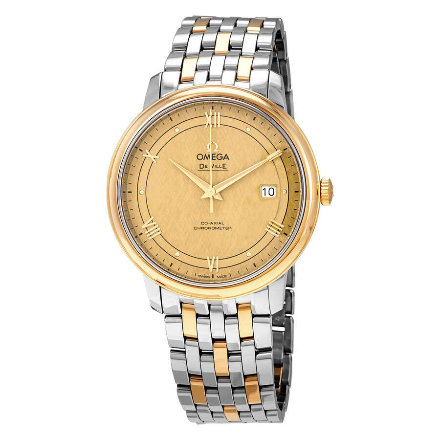 Stainless steel case with a stainless steel bracelet with18kt yellow gold links. Fixed 18kt yellow gold bezel. Yellow gold (silk pattern) dial with yellow gold-tone dauphine-style hands and alternating Roman numeral and dot hour markers. Minute markers around the outer rim. Dial Type: Analog. Date display at the 3 o'clock position. Omega Calibre 2500 Automatic movement, based upon ETA 2892-A2, containing 27 Jewels, bitting at 25200 vph, and has a power reserve of approximately 48 hours. Scratch resistant sapphire crystal. Pull / push crown. Solid case back. Round case shape. Case size: 39.5 mm. Band width: 20 mm. Hidden fold over clasp. Water resistant at 30 meters / 100 feet. Functions: date, hour, minute, second, co-axial escapement, chronometer. De Ville Series. Luxury watch style. Watch label: Swiss Made. Omega De Ville Yellow Gold Dial Men's Watch 424.20.40.20.08.001. INFORMATION Brand: Omega Series: De Ville Collection Name: De Ville Gender: Mens Model: 424.20.40.20.08.001 Watch Label: Swiss Made Movement: Automatic Engine: Omega Calibre 2500 Power Reserve: 48 hours CASE Case Size: 39.5 mm Case Material: Stainless Steel Case Shape: Round Case Back: Solid BAND Band Material: Stainless Steel with18kt Yellow Gold Links Band Type: Bracelet Band Color: Silver-tone Band Width: 20 mm Clasp: Hidden Fold Over DIAL Dial Color: Yellow Gold (Silk Pattern) Type: Analog Crystal: Scratch Resistant Sapphire Hands: Yellow Gold-tone Dauphine-style Dial Markers: Alternating Roman Numeral and Dot Second Markers: Minute Markers around the outer rim Bezel: Fixed Bezel Material: 18kt Yellow Gold Crown: Pull / Push FEATURES Water Resistance: 30 meters / 100 feet Calendar: Date display at the 3 o'clock position Functions: Date, Hour, Minute, Second, Co-Axial Escapement, Chronometer Watch Features: Stainless Steel, Gold, Chronometer, Analog ADDITIONAL INFO Watch Style: Luxury Warranty: 4 Year Jomashop Warranty UPC Code: 7612586285684 Jomashop Sku: OM42420402008001 Department: Watches Category: Watches
