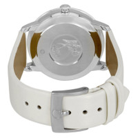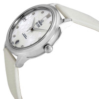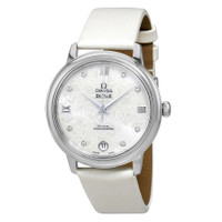 Stainless steel case with a white (satin brushed) leather strap. Fixed stainless steel bezel. Mother of pearl butterfly dial with silver-tone dauphine-style hands and diamond hour markers. Roman numerals mark the 3, 6, 9 and 12 o'clock positions. Dial Type: Analog. Date display at the 6 o'clock position. Omega calibre 2500 automatic movement, based upon ETA 2892-A2, containing 27 Jewels, bitting at 25200 vph, and has a power reserve of approximately 48 hours. Scratch resistant sapphire crystal. Pull / push crown. Solid case back. Round case shape. Case size: 32.7 mm. Case thickness: 9.5 mm. Band width: 16 mm. Tang clasp. Water resistant at 30 meters / 100 feet. Functions: date, hour, minute, second, co-axial escapement, chronometer. De Ville Prestige Series. Luxury watch style. Watch label: Swiss Made. Omega DeVille Prestige Mother of Pearl Butterfly Dial Ladies Watch 424.12.33.20.55.001. INFORMATION Brand: Omega Series: De Ville Prestige Collection Name: De Ville Prestige Gender: Womens Model: 424.12.33.20.55.001 Watch Label: Swiss Made Movement: Automatic Engine: Omega Calibre 2500 Power Reserve: 48 hours CASE Case Size: 32.7 mm Case Thickness: 9.5 mm Case Material: Stainless Steel Case Shape: Round Case Back: Solid BAND Band Material: (Satin Brushed) Leather Band Type: Strap Band Color: White Band Width: 16 mm Clasp: Tang DIAL Dial Color: Mother of Pearl Butterfly Type: Analog Crystal: Scratch Resistant Sapphire Hands: Silver-tone Dauphine-style Dial Markers: Diamond Second Markers: Roman Numerals mark the 3, 6, 9 and 12 o'clock positions Bezel: Fixed Bezel Color: Silver-tone Bezel Material: Stainless Steel Crown: Pull / Push FEATURES Water Resistance: 30 meters / 100 feet Calendar: Date display at the 6 o'clock position Functions: Date, Hour, Minute, Second, Co-Axial Escapement, Chronometer Watch Features: Diamond, Stainless Steel, Leather, Chronometer, Analog ADDITIONAL INFO Watch Style: Luxury Warranty: 4 Year Jomashop Warranty UPC Code: 7612586247729 Jomashop Sku: OM42412332055001 Department: Watches Category: Watches