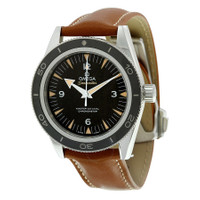 Stainless steel case with a brown leather strap. Uni-directional rotating coin edge stainless steel bezel with a black ceramic (count-up elapsed time) top ring. Black dial with luminous silver-tone arrow-shaped hands and index hour markers. Arabic numerals mark the 3, 6, 9 amd 12 o'clock positions. Minute markers around the outer rim. Dial Type: Analog. Luminescent hands and markers. Omega calibre 8400 automatic movement, based upon Omega 8500, containing 39 Jewels, bitting at 25200 vph, and has a power reserve of approximately 60 hours. Scratch resistant sapphire crystal. Screw down crown. Transparent case back. Round case shape. Case size: 41 mm. Case thickness: 14 mm. Band width: 21 mm. Fold over with push button release clasp. Water resistant at 300 meters / 1000 feet. Functions: hour, minute, second, co-axial escapement, chronometer. Seamaster 300 Series. Luxury watch style. Watch label: Swiss Made. Omega Seamaster 300 Automatic Black Dial Men's Watch 233.32.41.21.01.002. GENERAL Box Type: Original Box CASE Case Size: 41 Case Thickness: 14 mm Case Material: Stainless Steel Case Shape: Round Case Back: Transparent BAND Band Material: Leather Band Type: Strap Band Color: Brown Band Width: 21 mm Clasp: Fold Over with Push Button Release DIAL Dial Color: Black Type: Analog Crystal: Scratch Resistant Sapphire Hands: Luminous Silver-tone Arrow-shaped Dial Markers: Index Second Markers: Arabic Numerals mark the 3, 6, 9 amd 12 o'clock positions. Minute Markers around the outer rim Luminiscence: Hands and Markers Bezel: Uni-directional Rotating Coin Edge Bezel Color: Silver-tone Bezel Material: Stainless Steel with a Black Ceramic (Count-Up Elapsed Time) Top Ring Crown: Screw Down INFORMATION Brand: Omega Series: Seamaster Collection Name: Seamaster 300 Gender: Mens Model: 233.32.41.21.01.002 Watch Label: Swiss Made Movement: Automatic Engine: Omega Calibre 8400 Power Reserve: 60 hours FEATURES Water Resistance: 300 meters / 1000 feet Functions: Hour, Minute, Second, Co-Axial Escapement, Chronometer Watch Features: Analog, Chronometer, Ceramic, Leather, Stainless Steel ADDITIONAL INFO Watch Style: Luxury Warranty: 4 Year Jomashop Warranty UPC Code: 7612586256516 Jomashop Sku: OM23332412101002 Department: Watches Category: Watches