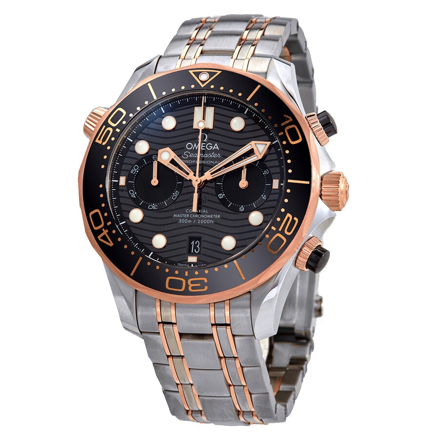 Stainless steel case with a stainless steel bracelet with 18kt sedna gold accents. Uni-directional rotating 18kt sedna gold bezel with a black ceramic (count-up elapsed time) top ring. Black dial with luminous rose gold-tone skeleton hands and dot hour markers. Minute markers around the outer rim. Dial Type: Analog. Luminescent hands and markers. Date display at the 6 o'clock position. Chronograph - two sub-dials displaying: 60 second and 12 hour. Omega calibre 9900 automatic movement, based upon Omega 9300, containing 54 Jewels, bitting at 28800 vph, and has a power reserve of approximately 60 hours. Scratch resistant sapphire crystal. Screw down crown. Transparent s case back. Round case shape. Case size: 44 mm. Band width: 21 mm. Fold over clasp with a push button release. Water resistant at 300 meters / 1000 feet. Functions: chronograph, date, hour, minute, second,chronometer. Seamaster 300 Master Co-axial Series. Dive watch style. Watch label: Swiss Made. Omega Seamaster 300 Master Co-Axial Chronograph Automatic Chronometer Black Dial Men's Watch 210.20.44.51.01.001. INFORMATION Brand: Omega Series: Seamaster 300 Master Co-Axial Collection Name: Seamaster 300 Master Co-Axial Gender: Mens Model: 210.20.44.51.01.001 Watch Label: Swiss Made Movement: Automatic Engine: Omega Calibre 9900 Power Reserve: 60 hours CASE Case Size: 44 mm Case Material: Stainless Steel Case Shape: Round Case Back: Transparent S BAND Band Material: Stainless Steel with 18kt Sedna Gold Accents Band Type: Bracelet Band Color: Two-tone (Silver-tone and Rose Gold-tone) Band Width: 21 mm Clasp: Fold Over with Push Button Release DIAL Dial Color: Black Type: Analog Crystal: Scratch Resistant Sapphire Hands: Luminous Rose Gold-tone Skeleton Dial Markers: Dot Second Markers: Minute Markers around the outer rim Sub Dials: Two - 60 Second and 12 Hour Luminiscence: Hands and Markers Bezel: Uni-directional Rotating Bezel Color: Black Ceramic Count-Up Elapsed Time Top Ring Bezel Material: 18kt Sedna Gold with a Black Ceramic (Count-Up Elapsed Time) Top Ring Crown: Screw Down FEATURES Water Resistance: 300 meters / 1000 feet Calendar: Date display at the 6 o'clock position Functions: Chronograph, Date, Hour, Minute, Second,Chronometer Watch Features: Analog, Chronometer, Ceramic, Gold, Stainless Steel, Chronograph ADDITIONAL INFO Watch Style: Dive Warranty: 4 Year Jomashop Warranty UPC Code: 7612586301728 Jomashop Sku: OM21020445101001 Department: Watches Category: Watches