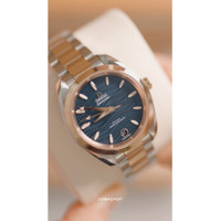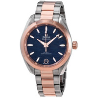 Stainless steel case with a stainless steel bezel with 18kt sedna gold center links. Fixed 18kt sedna gold bezel. Blue dial with luminous rose gold arrow-shaped hands and index hour markers. Dial Type: Analog. Luminescent hands and markers. Date display at the 6 o'clock position. Omega calibre 8800 automatic movement, containing 35 Jewels, bitting at 25200 vph, and has a power reserve of approximately 55 hours. Scratch resistant sapphire crystal. Transparent case back. Round case shape. Case size: 34 mm. Band width: 16 mm. Fold over clasp. Water resistant at 150 meters / 500 feet. Functions: date, hour, minute, second. Seamaster Aqua Terra Series. Luxury watch style. Watch label: Swiss Made. Omega Seamaster Aqua Terra Automatic Blue Dial Watch 220.20.34.20.03.001. INFORMATION Brand: Omega Series: Seamaster Aqua Terra Collection Name: Seamaster Aqua Terra Gender: Womens Model: 220.20.34.20.03.001 Watch Label: Swiss Made Movement: Automatic Engine: Omega Calibre 8800 Power Reserve: 55 hours CASE Case Size: 34 mm Case Material: Stainless Steel Case Shape: Round Case Back: Transparent BAND Band Material: Stainless Steel with 18kt Sedna Gold Band Type: Bracelet Band Color: Silver-tone Band Width: 16 mm Clasp: Fold Over DIAL Dial Color: Blue Type: Analog Crystal: Scratch Resistant Sapphire Hands: Luminous Rose Gold Arrow-shaped Dial Markers: Index Luminiscence: Hands and Markers Bezel: Fixed Bezel Material: 18kt Sedna Gold FEATURES Water Resistance: 150 meters / 500 feet Calendar: Date display at the 6 o'clock position Functions: Date, Hour, Minute, Second Watch Features: Stainless Steel, Gold, Analog ADDITIONAL INFO Watch Style: Luxury Warranty: 4 Year Jomashop Warranty UPC Code: 785449182059 Jomashop Sku: OM22020342003001 Department: Watches Category: Watches