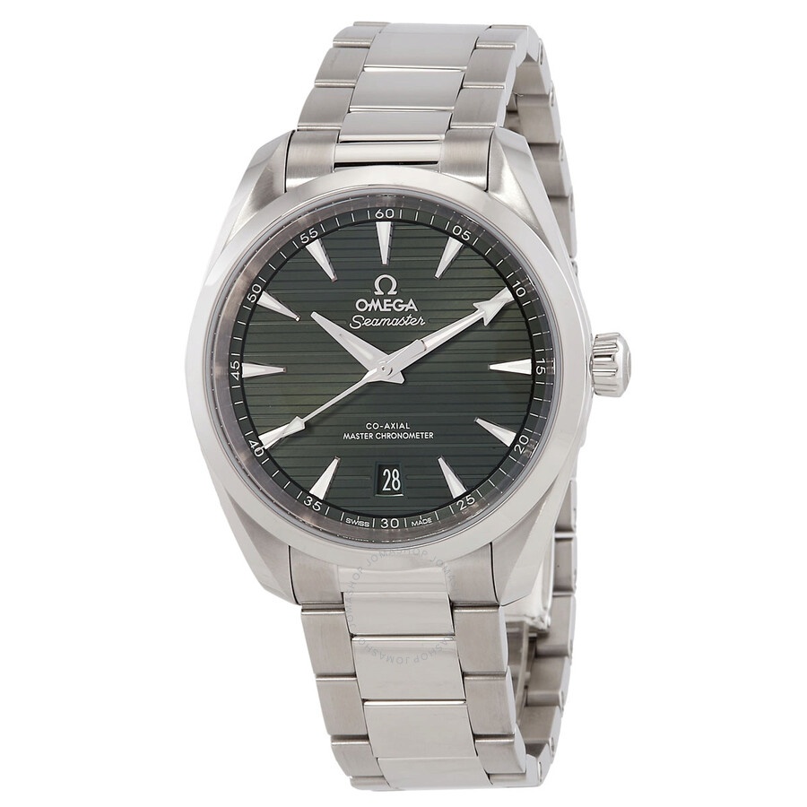 Silver-tone stainless steel case and bracelet. Fixed silver-tone stainless steel bezel. Green dial with silver-tone hands and index hour markers. Minute scale around the inner rim. Dial Type: Analog. Luminescent hands and markers. Date display at the 6 o'clock position. Omega Calibre 8800 Automatic movement, containing 35 Jewels, bitting at 25200 vph, and has a power reserve of approximately 55 hours. Scratch resistant sapphire crystal. Transparent see through case back. Round case shape, case size: 38 mm, case thickness: 12.2 mm. Fold over clasp with a safety release. Water resistant at 150 meters / 500 feet. Functions: date, hour, minute, second. Seamaster Aqua Terra Series. Sport watch style. Watch label: Swiss Made. Omega Seamaster Aqua Terra Automatic Green Dial Men's Watch 22010382010003. CASE Case Size: 38 Case Thickness: 12.2 mm Case Material: Stainless Steel Case Shape: Round Case Back: Transparent See Through BAND Band Material: Stainless Steel Band Type: Bracelet Band Color: Silver-tone Clasp: Fold Over with Safety Release DIAL Dial Color: Green Type: Analog Crystal: Scratch Resistant Sapphire Hands: Silver-tone Dial Markers: Index Second Markers: Minute Scale around the inner rim Luminiscence: Hands and Markers Bezel: Fixed Bezel Color: Silver-tone Bezel Material: Stainless Steel INFORMATION Brand: Omega Series: Seamaster Collection Name: Seamaster Aqua Terra Gender: Mens Model: 220.10.38.20.10.003 Watch Label: Swiss Made Movement: Automatic Engine: Omega Calibre 8800 Power Reserve: 55 hours FEATURES Water Resistance: 150 meters / 500 feet Calendar: Date display at the 6 o'clock position Functions: Date, Hour, Minute, Second Watch Features: Stainless Steel, Analog ADDITIONAL INFO Watch Style: Sport Warranty: 4 Year Jomashop Warranty Jomashop Sku: OM22010382010003 Department: Watches Category: Watches