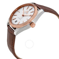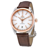 Stainless steel case with a brown (alligator) leather strap. Fixed 18kt sedna gold bezel. Silver dial with luminous 18kt sedna gold arrow-shaped hands and index hour markers. Minute markers around the outer rim. Dial Type: Analog. Luminescent hands and markers. Date display at the 6 o'clock position. Omega calibre 8900 automatic movement, based upon Omega 8500, containing 39 Jewels, bitting at 25200 vph, and has a power reserve of approximately 60 hours. Scratch resistant sapphire crystal. Screw down crown. Transparent case back. Round case shape. Case size: 41 mm. Case thickness: 13.2 mm. Band width: 20 mm. Fold over clasp. Water resistant at 150 meters / 500 feet. Functions: date, hour, minute, second, co-axial escapement, chronometer. Seamaster Aqua Terra Series. Luxury watch style. Watch label: Swiss Made. Omega Seamaster Aqua Terra Automatic Men's Watch 220.23.41.21.02.001. GENERAL Box Type: Original Box CASE Case Size: 41 Case Thickness: 13.2 mm Case Material: Stainless Steel Case Shape: Round Case Back: Transparent BAND Band Material: (Alligator) Leather Band Type: Strap Band Color: Brown Band Width: 20 mm Clasp: Fold Over DIAL Dial Color: Silver Type: Analog Crystal: Scratch Resistant Sapphire Hands: Luminous 18kt Sedna Gold Arrow-shaped Dial Markers: Index Second Markers: Minute Markers around the outer rim Luminiscence: Hands and Markers Bezel: Fixed Bezel Material: 18kt Sedna Gold Crown: Screw Down INFORMATION Brand: Omega Series: Seamaster Collection Name: Seamaster Aqua Terra Gender: Mens Model: 220.23.41.21.02.001 Watch Label: Swiss Made Movement: Automatic Engine: Omega Calibre 8900 Power Reserve: 60 hours FEATURES Water Resistance: 150 meters / 500 feet Calendar: Date display at the 6 o'clock position Functions: Date, Hour, Minute, Second, Co-Axial Escapement, Chronometer Watch Features: Alligator Leather, Analog, Chronometer, Gold, Leather, Stainless Steel ADDITIONAL INFO Watch Style: Luxury Warranty: 4 Year Jomashop Warranty UPC Code: 7612586269752 Jomashop Sku: OM22023412102001 Department: Watches Category: Watches