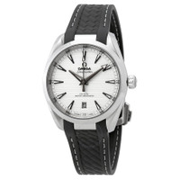 Stainless steel case with a grey rubber strap. Fixed smooth stainless steel bezel. Silver dial with luminous black arrow-shaped hands and index hour markers. Arabic numeral minute markers (at 5 minute intervals). Minute markers around the outer rim. Dial Type: Analog. Luminescent hands and markers. Date display at the 6 o'clock position. Omega calibre 8800 automatic movement, containing 35 Jewels, bitting at 25200 vph, and has a power reserve of approximately 55 hours. Scratch resistant sapphire crystal. Screw down crown. Transparent case back. Round case shape. Case size: 38 mm. Case thickness: 12.2 mm. Band width: 19 mm. Deployment clasp. Water resistant at 150 meters / 500 feet. Functions: date, hour, minute, second. Seamaster Aqua Terra Series. Luxury watch style. Watch label: Swiss Made. Omega Seamaster Aqua Terra Automatic Silver Dial Men's Watch 220.12.38.20.02.001. GENERAL Box Type: Original Box CASE Case Size: 38 Case Thickness: 12.2 mm Case Material: Stainless Steel Case Shape: Round Case Back: Transparent BAND Band Material: Rubber Band Type: Strap Band Color: Grey Band Width: 19 mm Clasp: Deployment DIAL Dial Color: Silver Type: Analog Crystal: Scratch Resistant Sapphire Hands: Luminous Black Arrow-shaped Dial Markers: Index Second Markers: Arabic Numeral Minute Markers (at 5 minute intervals). Minute Markers around the outer rim Luminiscence: Hands and Markers Bezel: Fixed Smooth Bezel Color: Silver-tone Bezel Material: Stainless Steel Crown: Screw Down INFORMATION Brand: Omega Series: Seamaster Collection Name: Seamaster Aqua Terra Gender: Mens Model: 220.12.38.20.02.001 Watch Label: Swiss Made Movement: Automatic Engine: Omega Calibre 8800 Power Reserve: 55 hours FEATURES Water Resistance: 150 meters / 500 feet Calendar: Date display at the 6 o'clock position Functions: Date, Hour, Minute, Second Watch Features: Analog, Rubber, Stainless Steel ADDITIONAL INFO Watch Style: Luxury Warranty: 4 Year Jomashop Warranty UPC Code: 7612586270079 Jomashop Sku: OM22012382002001 Department: Watches Category: Watches