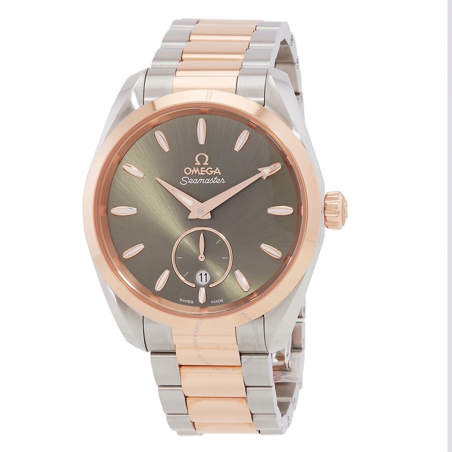 Stainless steel case with a stainless steel bracelet with 18kt rose gold links. Fixed 18kt rose gold bezel. Green dial with luminous rose gold-tone hands and index hour markers. Dial Type: Analog. Luminescent hands and markers. Date display above the 6 o'clock position. Small seconds sub-dial. Omega calibre 8802 automatic movement, based upon Omega 8800, containing 35 Jewels, bitting at 25200 vph, and has a power reserve of approximately 55 hours. Scratch resistant sapphire crystal. Screw down crown. Transparent case back. Round case shape. Case size: 38 mm. Band width: 19 mm. Fold over clasp. Water resistant at 150 meters / 500 feet. Functions: date, hour, minute, small second, co-axial escapement, chronometer, magnetic resistant. Additional Info: original box, manual (complete accessories). Seamaster Series. Luxury watch style. Watch label: Swiss Made. Omega Seamaster Automatic Chronometer Green Dial Men's Watch 220.20.38.20.10.001. INFORMATION Brand: Omega Series: Seamaster Collection Name: Seamaster Gender: Mens Model: 220.20.38.20.10.001 Watch Label: Swiss Made Movement: Automatic Engine: Omega Calibre 8802 Power Reserve: 55 hours CASE Case Size: 38 mm Case Material: Stainless Steel Case Shape: Round Case Back: Transparent BAND Band Material: Stainless Steel with 18kt Rose Gold Links Band Type: Bracelet Band Color: Silver-tone Band Width: 19 mm Clasp: Fold Over DIAL Dial Color: Green Type: Analog Crystal: Scratch Resistant Sapphire Hands: Luminous Rose Gold-tone Dial Markers: Index Sub Dials: Small Seconds Luminiscence: Hands and Markers Bezel: Fixed Bezel Color: Rose Gold-tone Bezel Material: 18kt Rose Gold Crown: Screw Down FEATURES Water Resistance: 150 meters / 500 feet Calendar: Date display above the 6 o'clock position Functions: Date, Hour, Minute, Small Second, Co-Axial Escapement, Chronometer, Magnetic Resistant Watch Features: Stainless Steel, Gold, Chronometer, Analog ADDITIONAL INFO Watch Style: Luxury Warranty: 2 Year Jomashop Warranty Additional Info: Original Box, Manual (Complete Accessories) Jomashop Sku: OM22020382010001 Department: Watches Category: Watches