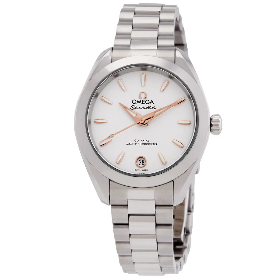 Silver-tone stainless steel case and bracelet. Fixed silver-tone stainless steel bezel. Silver dial with rose gold-tone hands and index hour markers. Minute markers around the outer rim. Dial Type: Analog. Luminescent hands and markers. Date display at the 6 o'clock position. Omega Calibre 8750 automatic movement with a 48-hour power reserve. Scratch resistant sapphire crystal. Transparent see through case back. Round case shape, case size: 30 mm, case thickness: 10.55 mm. Band width: 14 mm. Butterfly clasp. Water resistant at 150 meters / 500 feet. Functions: date, hour, minute, second. Seamaster Series. Luxury watch style. Watch label: Swiss Made. Omega Seamaster Automatic Silver Dial Ladies Watch 22010302002001. GENERAL Box Type: Original Box CASE Case Diameter: 30 mm Case Thickness: 10.55 mm Case Material: Stainless Steel Case Shape: Round Case Back: Transparent See Through BAND Band Material: Stainless Steel Band Type: Bracelet Band Color: Silver-tone Band Width: 14 mm Clasp: Butterfly DIAL Dial Color: Silver Type: Analog Crystal: Scratch Resistant Sapphire Hands: Rose Gold-tone Dial Markers: Index Second Markers: Minute Markers around the outer rim Luminiscence: Hands and Markers Bezel: Fixed Bezel Color: Silver-tone Bezel Material: Stainless Steel INFORMATION Brand: Omega Series: Seamaster Collection Name: Seamaster Gender: Womens Model: 22010302002001 Watch Label: Swiss Made Movement: Automatic Engine: Omega Calibre 8750 Power Reserve: 48 hours FEATURES Water Resistance: 150 meters / 500 feet Calendar: Date display at the 6 o'clock position Functions: Date, Hour, Minute, Second Watch Features: Analog, Gold, Stainless Steel ADDITIONAL INFO Watch Style: Luxury Warranty: 4 Year Jomashop Warranty Jomashop Sku: OM22010302002001 Department: Watches