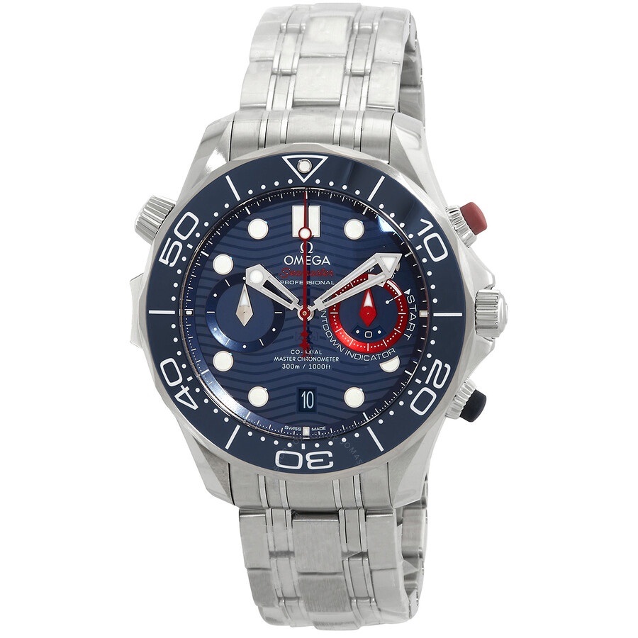 Stainless steel case with a stainless steel bracelet. Uni-directional rotating stainless steel bezel with an inlaid blue ceramic ring. Blue dial with luminous silver-tone hands and dot hour markers. Minute markers around the outer rim. Dial Type: Analog. Date display at the 6 o'clock position. Chronograph - two sub-dials displaying: 60 second and 12 hour. Omega calibre 9900 automatic movement, based upon Omega 9300, containing 54 Jewels, bitting at 28800 vph, and has a power reserve of approximately 60 hours. Scratch resistant sapphire crystal. Screw down crown. Transparent case back. Round case shape. Case size: 44 mm. Band width: 21 mm. Deployment clasp. Water resistant at 30 meters / 100 feet. Functions: chronograph, column wheel, date, hour, minute, second, co-axial escapement, chronometer. Additional Info: original box, manual (complete accessories). Seamaster Series. Luxury watch style. Watch label: Swiss Made. Omega Seamaster Chronograph Automatic Chronometer Blue Dial Men's Watch 210.30.44.51.03.002. INFORMATION Brand: Omega Series: Seamaster Collection Name: Seamaster Gender: Mens Model: 210.30.44.51.03.002 Watch Label: Swiss Made Movement: Automatic Engine: Omega Calibre 9900 Power Reserve: 60 hours CASE Case Size: 44 mm Case Material: Stainless Steel Case Shape: Round Case Back: Transparent BAND Band Material: Stainless Steel Band Type: Bracelet Band Color: Silver-tone Band Width: 21 mm Clasp: Deployment DIAL Dial Color: Blue Type: Analog Crystal: Scratch Resistant Sapphire Hands: Luminous Silver-tone Dial Markers: Dot Second Markers: Minute Markers around the outer rim Sub Dials: Two - 60 Second and 12 Hour Luminiscence: Hands and Markers Bezel: Uni-directional Rotating Bezel Color: Silver-tone Bezel Material: Stainless Steel with an inlaid Blue Ceramic Ring Crown: Screw Down FEATURES Water Resistance: 30 meters / 100 feet Calendar: Date display at the 6 o'clock position Functions: Chronograph, Column Wheel, Date, Hour, Minute, Second, Co-Axial Escapement, Chronometer Watch Features: Chronograph, Stainless Steel, Ceramic, Chronometer, Analog ADDITIONAL INFO Watch Style: Luxury Warranty: 2 Year Jomashop Warranty Additional Info: Original Box, Manual (Complete Accessories) Jomashop Sku: OM21030445103002 Department: Watches Category: Watches