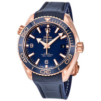 Sedna gold case with a blue leather (rubber lined) strap. Uni-directional rotating sedna gold bezel with a blue cermic top ring. Blue dial with luminous rose gold-tone hands and index hour markers. Arabic numerals mark the 6, 9 and 12 o'clock positions. Minute markers around the outer rim. Dial Type: Analog. Luminescent hands and markers. Date display at the 3 o'clock position. Omega calibre 8901 automatic movement with a 60-hour power reserve. Scratch resistant sapphire crystal. Screw down crown. Transparent case back. Case size: 43.5 mm. Round case shape. Strap width: 21 mm. Deployment clasp. Water resistant at 600 meters / 2000 feet. Functions: date, hour, minute, second. Luxury watch style. Watch label: Swiss Made. Omega Seamaster Planet Ocean Automatic 18kt Sedna Gold Men's Watch 215.63.44.21.03.001. GENERAL Box Type: Original Box CASE Case Size: 43 Case Material: 18kt Sedna Gold Case Shape: Round Case Back: Transparent BAND Band Material: Leather (Rubber Lined) Band Type: Strap Band Color: Blue Band Width: 21 mm Clasp: Deployment DIAL Dial Color: Blue Type: Analog Crystal: Scratch Resistant Sapphire Hands: Luminous Rose Gold-tone Arrow-shaped Dial Markers: Index Second Markers: Arabic Numerals mark the 6, 9 and 12 o'clock positions. Minute Markers around the outer rim Luminiscence: Hands and Markers Bezel: Uni-directional Rotating Bezel Material: Sedna Gold Crown: Screw Down INFORMATION Brand: Omega Series: Seamaster Collection Name: Seamaster Planet Ocean Gender: Mens Model: 215.63.44.21.03.001 Watch Label: Swiss Made Movement: Automatic Engine: Omega Calibre 8901 Power Reserve: 60 hours FEATURES Water Resistance: 600 meters / 2000 feet Calendar: Date display at the 3 o'clock position Functions: Date, Hour, Minute, Second, Co-Axial Escapement, Chronometer Watch Features: Analog, Chronometer, Gold, Leather, Rubber ADDITIONAL INFO Watch Style: Luxury Warranty: 4 Year Jomashop Warranty UPC Code: 7612586263514 Jomashop Sku: OM21563442103001 Department: Watches Category: Watches