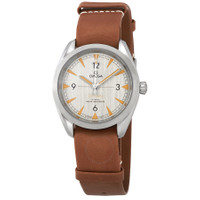 Stainless steel case with a brown leather (NATO) strap. Fixed stainless steel bezel. Brushed grey dial with orange silver-tone hands and index hour markers. Arabic numerals mark the 3, 6, 9 and 12 o'clock positions. Minute markers around the outer rim. Dial Type: Analog. Luminescent hands and markers. Omega calibre 8806 automatic movement with a 55-hour power reserve. Scratch resistant sapphire crystal. Screw down crown. Solid case back. Round case shape. Case size: 40 mm. Band width: 20 mm. Tang clasp. Water resistant at 150 meters / 500 feet. Functions: hour, minute, second. Dive watch style. Watch label: Swiss Made. Omega Seamaster Railmaster Brushed Grey Dial Automatic Men's Watch 220.12.40.20.06.001. INFORMATION Brand: Omega Series: Seamaster Railmaster Collection Name: Seamaster Railmaster Gender: Mens Model: 220.12.40.20.06.001 Watch Label: Swiss Made Movement: Automatic Engine: Omega Calibre 8806 Power Reserve: 55 hours CASE Case Size: 40 mm Case Material: Stainless Steel Case Shape: Round Case Back: Solid BAND Band Material: Leather Band Type: Strap Band Color: Brown Band Width: 20 mm Clasp: Tang DIAL Dial Color: Brushed Grey Type: Analog Crystal: Scratch Resistant Sapphire Hands: Orange Silver-tone Dial Markers: Index Second Markers: Arabic Numerals mark the 3, 6, 9 and 12 o'clock positions. Minute Markers around the outer rim Luminiscence: Hands and Markers Bezel: Fixed Bezel Color: Silver-tone Bezel Material: Stainless Steel Crown: Screw Down FEATURES Water Resistance: 150 meters / 500 feet Functions: Hour, Minute, Second Watch Features: Stainless Steel, Leather, Analog ADDITIONAL INFO Watch Style: Dive Warranty: 4 Year Jomashop Warranty UPC Code: 7612586270598 Jomashop Sku: OM22012402006001 Department: Watches Category: Watches
