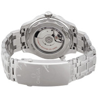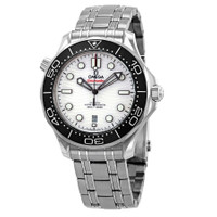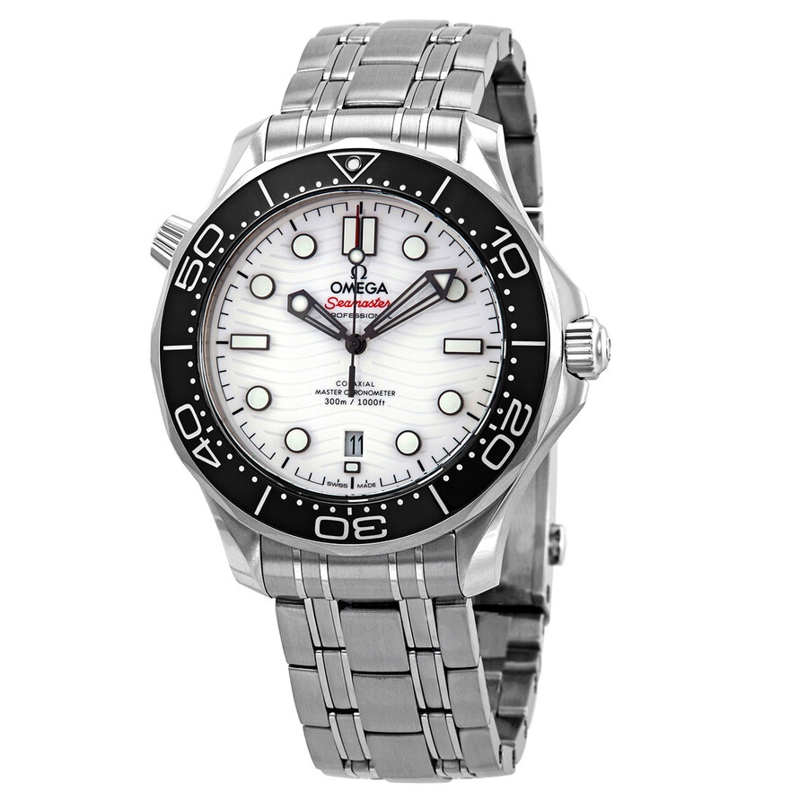 Stainless steel case with a stainless steel bracelet. Uni-directional rotating stainless steel bezel with a black ceramic (count-up elapsed time) ring. White dial with black skeleton hands and dot hour markers. Minute markers around the outer rim. Dial Type: Analog. Luminescent hands and markers. Date display at the 6 o'clock position. Omega calibre 8800 automatic movement, containing 35 Jewels, bitting at 25200 vph, and has a power reserve of approximately 55 hours. Scratch resistant sapphire crystal. Screw down crown. Transparent case back. Round case shape. Case size: 42 mm. Band width: 20 mm. Fold over clasp with a push button release. Water resistant at 300 meters / 1000 feet. Functions: date, hour, minute, second, co-axial escapement, chronometer. Seamaster Series. Dive watch style. Watch label: Swiss Made. Omega Seamaster White Dial Men's Watch 210.30.42.20.04.001. INFORMATION Brand: Omega Series: Seamaster Collection Name: Seamaster Gender: Mens Model: 210.30.42.20.04.001 Watch Label: Swiss Made Movement: Automatic Engine: Omega Calibre 8800 Power Reserve: 55 hours CASE Case Size: 42 mm Case Material: Stainless Steel Case Shape: Round Case Back: Transparent BAND Band Material: Stainless Steel Band Type: Bracelet Band Color: Silver-tone Band Width: 20 mm Clasp: Fold Over with Push Button Release DIAL Dial Color: White Type: Analog Crystal: Scratch Resistant Sapphire Hands: Black Skeleton Dial Markers: Dot Second Markers: Minute Markers around the outer rim Luminiscence: Hands and Markers Bezel: Uni-directional Rotating Count-Up Elapsed Time Bezel Color: Silver-tone Bezel Material: Stainless Steel with a Black Ceramic Ring Crown: Screw Down FEATURES Water Resistance: 300 meters / 1000 feet Calendar: Date display at the 6 o'clock position Functions: Date, Hour, Minute, Second, Co-Axial Escapement, Chronometer Watch Features: Stainless Steel, Ceramic, Chronometer, Analog ADDITIONAL INFO Watch Style: Dive Warranty: 4 Year Jomashop Warranty UPC Code: 7612586297960 Jomashop Sku: OM21030422004001 Department: Watches Category: Watches