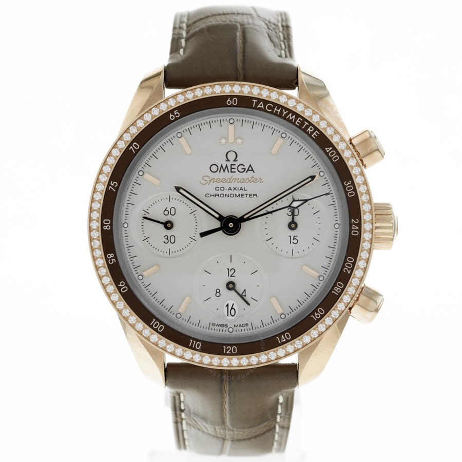 Rose gold-tone 18kt rose gold case with a brown leather strap. Fixed rose gold-tone bezel with diamond set 18kt rose gold. Silver-tone dial with rose gold-tone hands and Arabic numeral & index hour markers. Minute markers around the outer rim. Dial Type: Analog. Luminescent hands and markers. Date display at the 6 o'clock position. Chronograph - three sub-dials displaying: 60 second, 30 minute and 12 hour. Omega Calibre 3330 Automatic movement, based upon ETA Valjoux 7753, containing 31 Jewels, bitting at 28800 vph, and has a power reserve of approximately 52 hours. Scratch resistant sapphire crystal. Solid case back. Round case shape, case size: 38 mm. Deployment with push button release clasp. Water resistant at 100 meters / 330 feet. Functions: chronograph, date, hour, minute, second, co-axial escapement, chronometer. Speedmaster Series. Luxury watch style. Watch label: Swiss Made. Omega Speedmaster Chronograph Automatic Chronometer Diamond Silver Dial Ladies Watch 324.68.38.50.02.003. CASE Case Size: 38 Case Material: 18kt Rose Gold Case Shape: Round Case Back: Solid BAND Band Material: Leather Band Type: Strap Band Color: Brown Clasp: Deployment with Push Button Release DIAL Dial Color: Silver-tone Type: Analog Crystal: Scratch Resistant Sapphire Hands: Rose Gold-tone Dial Markers: Arabic Numeral & Index Second Markers: Minute Markers around the outer rim Sub Dials: Three - 60 Second, 30 Minute and 12 Hour Luminiscence: Hands and Markers Bezel: Fixed Bezel Color: Rose Gold-tone Bezel Material: Diamond Set 18kt Rose Gold INFORMATION Brand: Omega Series: Speedmaster Collection Name: Speedmaster Gender: Womens Model: 324.68.38.50.02.003 Watch Label: Swiss Made Movement: Automatic Engine: Omega Calibre 3330 Power Reserve: 52 hours FEATURES Water Resistance: 100 meters / 330 feet Calendar: Date display at the 6 o'clock position Functions: Chronograph, Date, Hour, Minute, Second, Co-Axial Escapement, Chronometer Watch Features: Analog, Chronometer, Gold, Leather, Chronograph, Diamond ADDITIONAL INFO Watch Style: Luxury Warranty: 4 Year Jomashop Warranty UPC Code: 785449196100 Jomashop Sku: OM32468385002003 Department: Watches