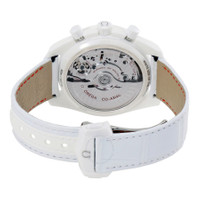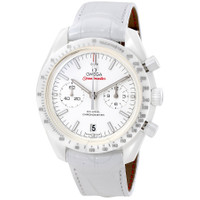 White ceramic case with a white (alligator) leather strap. Fixed white ceramic bezel showing tachymeter markings bezel. White dial with luminous silver-tone hands and index hour markers. Minute markers around the outer rim. Dial Type: Analog. Date display at the 6 o'clock position. Chronograph - two sub-dials displaying: 60 second and 12 hour. Omega calibre 9300 automatic movement, containing 54 Jewels, composed of 337 parts, bitting at 28800 vph, and has a power reserve of approximately 60 hours. Scratch resistant sapphire crystal. Screw down crown. Solid case back. Round case shape. Case size: 44.25 mm. Case thickness: 16.5 mm. Band width: 21 mm. Fold over clasp. Water resistant at 50 meters / 165 feet. Functions: chronograph, date, hour, minute, second, chronometer, tachymeter. Speedmaster Moonwatch Series. Luxury watch style. Watch label: Swiss Made. Omega Speedmaster Moonwatch White Side of the Moon Men's Watch 31193445104002. INFORMATION Brand: Omega Series: Speedmaster Moonwatch Collection Name: Speedmaster Moonwatch Gender: Mens Model: 311.93.44.51.04.002 Watch Label: Swiss Made Movement: Automatic Engine: Omega Calibre 9300 Power Reserve: 60 hours CASE Case Size: 44.25 mm Case Thickness: 16.5 mm Case Material: Ceramic Case Shape: Round Case Back: Solid BAND Band Material: (Alligator) Leather Band Type: Strap Band Color: White Band Width: 21 mm Clasp: Fold Over DIAL Dial Color: White Type: Analog Crystal: Scratch Resistant Sapphire Hands: Luminous Silver-tone Dial Markers: Index Second Markers: Minute Markers around the outer rim Sub Dials: Two - 60 Second and 12 Hour Bezel: Fixed Bezel Color: White Bezel Material: Ceramic showing Tachymeter Markings Crown: Screw Down FEATURES Water Resistance: 50 meters / 165 feet Calendar: Date display at the 6 o'clock position Functions: Chronograph, Date, Hour, Minute, Second, Chronometer, Tachymeter Watch Features: Alligator Leather, Analog, Chronometer, Ceramic, Leather, Chronograph ADDITIONAL INFO Watch Style: Luxury Warranty: 4 Year Jomashop Warranty UPC Code: 7612586257933 Jomashop Sku: OM31193445104002 Department: Watches Category: Watches