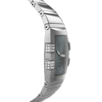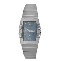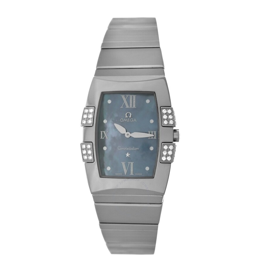 Silver-tone stainless steel case and bracelet. Fixed silver-tone bezel with diamond set stainless steel. Blue dial with silver-tone hands and Roman numeral & index hour markers. Dial Type: Analog. Quartz movement. Tonneau case shape, case size: 35 mm. Fold over clasp with a safety release. Functions: hour, minute. Constellation Quadrella Series. Casual watch style. Watch label: Swiss Made. Pre-owned Omega Constellation Quadrella Quartz Diamond Blue Dial Ladies Watch 1586.72. GENERAL Collection Name: Constellation Quadrella INFORMATION Brand: Omega Series: Constellation Model: 1586.72 Gender: Womens Watch Label: Swiss Made Movement: Quartz CONDITION INFORMATION Box: No Preowned Item Condition: Mint Papers: No Comments: The watch is in near-mint condition with no visible scratches to the naked eye but may have some tiny scratches under close-up inspection. The only exception is the hardly visible scratches on the back case. A new battery was installed and quartz movement keeps perfect time. The serial numbers are present and visible on the back case. The watch passed the water pressure test and we will include the printout of the test results. Fits the wrist up to 7.25 inches. Authenticity is 100% guaranteed. CASE Case Material: Stainless Steel Case Shape: Tonneau DIAL Type: Analog Dial Color: Blue Hands: Silver-tone Dial Markers: Roman Numeral & Index Bezel: Fixed Bezel Color: Silver-tone Bezel Material: Diamond Set Stainless Steel BAND Band Type: Bracelet Band Material: Stainless Steel Band Color: Silver-tone Clasp: Fold Over with Safety Release FEATURES Functions: Hour, Minute Watch Features: Analog, Stainless Steel, Diamond ADDITIONAL INFO Watch Style: Casual Warranty: 1 Year Jomashop Warranty Jomashop Sku: PRE-P-OM100137 Department: Watches
