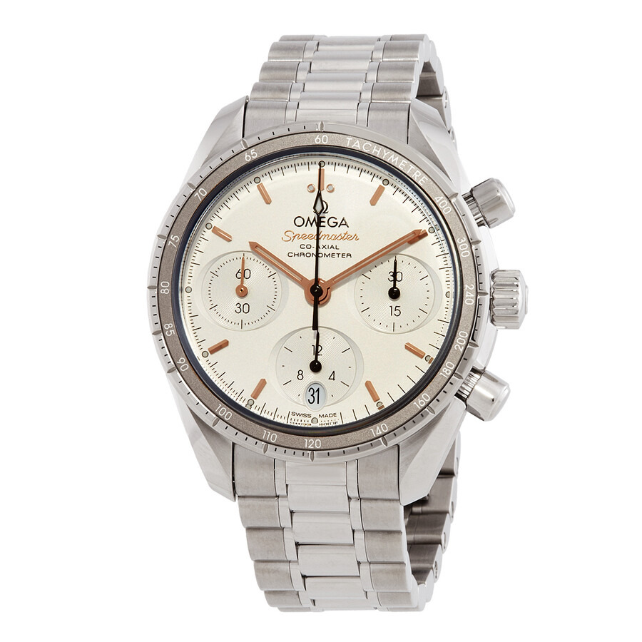 Pre-owned Silver-tone stainless steel case with a silver-tone stainless steel bracelet. Fixed tachymeter scale stainless steel bezel with a grey aluminium top ring. Silver dial with 18k sedna gold hands and index hour markers. Minute markers around the outer rim. Dial Type: Analog. Luminescent hands and markers. Chronograph - three sub-dials displaying: 60 second, 30 minute and 12 hour. Omega Calibre 3330 Automatic movement, based upon ETA Valjoux 7753, containing 31 Jewels, bitting at 28800 vph, and has a power reserve of approximately 52 hours. Scratch resistant sapphire crystal. Screw down crown. Solid case back. Round case shape, case size: 38 mm, case thickness: 13.2 mm. Band width: 18 mm. Fold over with push button release clasp. Water resistant at 100 meters / 330 feet. Functions: chronograph, tachymeter, hour, minute, second. Speedmaster Series. Luxury watch style. Watch label: Swiss Made. Omega Speedmaster Chronograph Automatic Silver Dial Men's Watch 324.30.38.50.02.001. GENERAL Year: 2018 Preowned Item Condition: Mint CASE Case Thickness: 13.2 mm Case Material: Stainless Steel Case Shape: Round Case Back: Solid BAND Band Material: Stainless Steel Band Type: Bracelet Band Color: Silver-tone Band Width: 18 mm Clasp: Fold Over with Push Button Release DIAL Dial Color: Silver Type: Analog Crystal: Scratch Resistant Sapphire Hands: 18K Sedna Gold Dial Markers: Index Second Markers: Minute Markers around the outer rim Sub Dials: Three - 60 Second, 30 Minute and 12 Hour Luminiscence: Hands and Markers Bezel: Fixed Tachymeter Scale Bezel Color: Grey Aluminium Top Ring Bezel Material: Stainless Steel Crown: Screw Down INFORMATION Brand: Omega Series: Speedmaster Collection Name: Speedmaster Gender: Mens Model: 324.30.38.50.02.001 Watch Label: Swiss Made Movement: Automatic Engine: Omega Calibre 3330 Power Reserve: 52 Hour FEATURES Water Resistance: 100 meters / 330 feet Functions: Chronograph, Tachymeter, Hour, Minute, Second Watch Features: Analog, Gold, Stainless Steel, Chronograph ADDITIONAL INFO Watch Style: Luxury Warranty: 1 Year Jomashop Warranty UPC Code: 7612586269158 Jomashop Sku: PRE-P-OM103611 Department: Watches Category: Watches