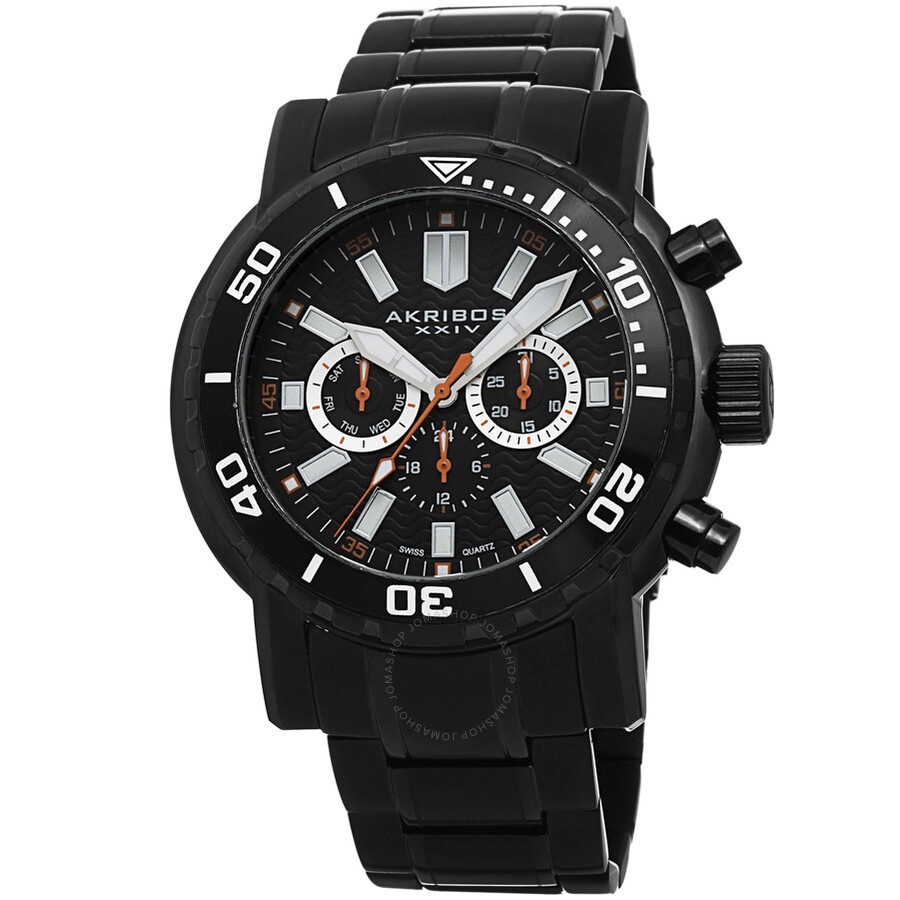 Black-plated stainless steel case and bracelet. Uni-directional rotating black-plated bezel. Black dial with luminous silver-tone hands and index hour markers. Arabic numeral minute markers (at 5 minute intervals). Minute markers around the outer rim. Dial Type: Analog. Luminescent hands and markers. Three multi-function sub-dials displaying: 24 hours, date and day of the week. Quartz movement. Scratch resistant mineral crystal. Pull / push crown. Screw down case back. Round case shape. Case size: 50 mm. Case thickness: 14.5 mm. Band width: 23 mm. Band length: 9 inches. Fold over clasp. Water resistant at 50 meters / 165 feet. Functions: hour, minute, second. Casual watch style. Watch label: Swiss Quartz. Akribos XXIV Black Dial Black-plated Men's Watch AK675BK. INFORMATION Brand: Akribos Xxiv Gender: Mens Model: AK675BK Watch Label: Swiss Quartz Movement: Quartz CASE Case Size: 50 mm Case Thickness: 14.5 mm Case Material: Stainless Steel Case Shape: Round Case Back: Screw Down BAND Band Material: Stainless Steel Band Type: Bracelet Band Color: Black-plated Band Length: 9 inches Band Width: 23 mm Clasp: Fold Over DIAL Dial Color: Black Type: Analog Crystal: Scratch Resistant Mineral Hands: Luminous Silver-tone Dial Markers: Index Second Markers: Arabic Numeral Minute Markers (at 5 minute intervals). Minute Markers around the outer rim Sub Dials: Three - 24 Hours, Date and Day of the Week Luminiscence: Hands and Markers Bezel: Uni-directional Rotating Bezel Color: Black-plated Bezel Material: Stainless Steel Crown: Pull / Push FEATURES Water Resistance: 50 meters / 165 feet Functions: Hour, Minute, Second Watch Features: Stainless Steel, Analog ADDITIONAL INFO Watch Style: Casual Warranty: With Manufacturers Guarantee UPC Code: 848572028455 Additional Info: Subdials: Three, date, day, 24 hour indicator Jomashop Sku: AK675BK Department: Watches Category: Watches